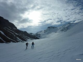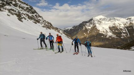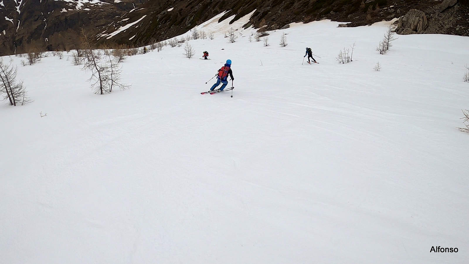 il meteo è peggiorato sin da subito e la mancanza di sole non ha permesso alla neve di mollare il giusto, soprattutto nella parte alta; da 2700 circa invece era ben sciabile purtroppo con visibilità non ottima. Le tre porzioni di valanga si superano agevolmente sia in salita (con rampant se rigela) che in discesa.