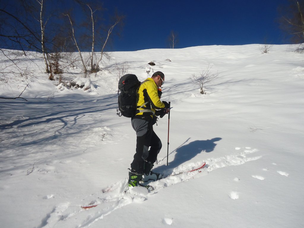 Seguito fedelmente la strada verso Paraloup ottimamente innevata sino alla presa dell’acquedotto. Da lì il buon Davide ha tracciato un’itinerario che ci ha portato praticamente sotto la grande Croce della dorsale. Poco dopo abbiamo dovuto desistere nei pressi della palina indicatrice delll’Arpiola a causa dell’onnipresente Eolo anche oggi molto agitato. Pazienza. Velocemente abbiamo spellato e poi dolori….Crosta infida difficilmente sciabile sino al pianoro del margaro. Da lì in poi seguito la traccia del sentiero estivo sino a raggiungere il Colletto La Francila. Poi finalmente qualche curva l’abbiamo fatta sui pendii che raggiungono la presa dell’acquedotto e la strada verso Chiot Rosa. Poi strada dura e gelata sino alla macchina. Alle prossime