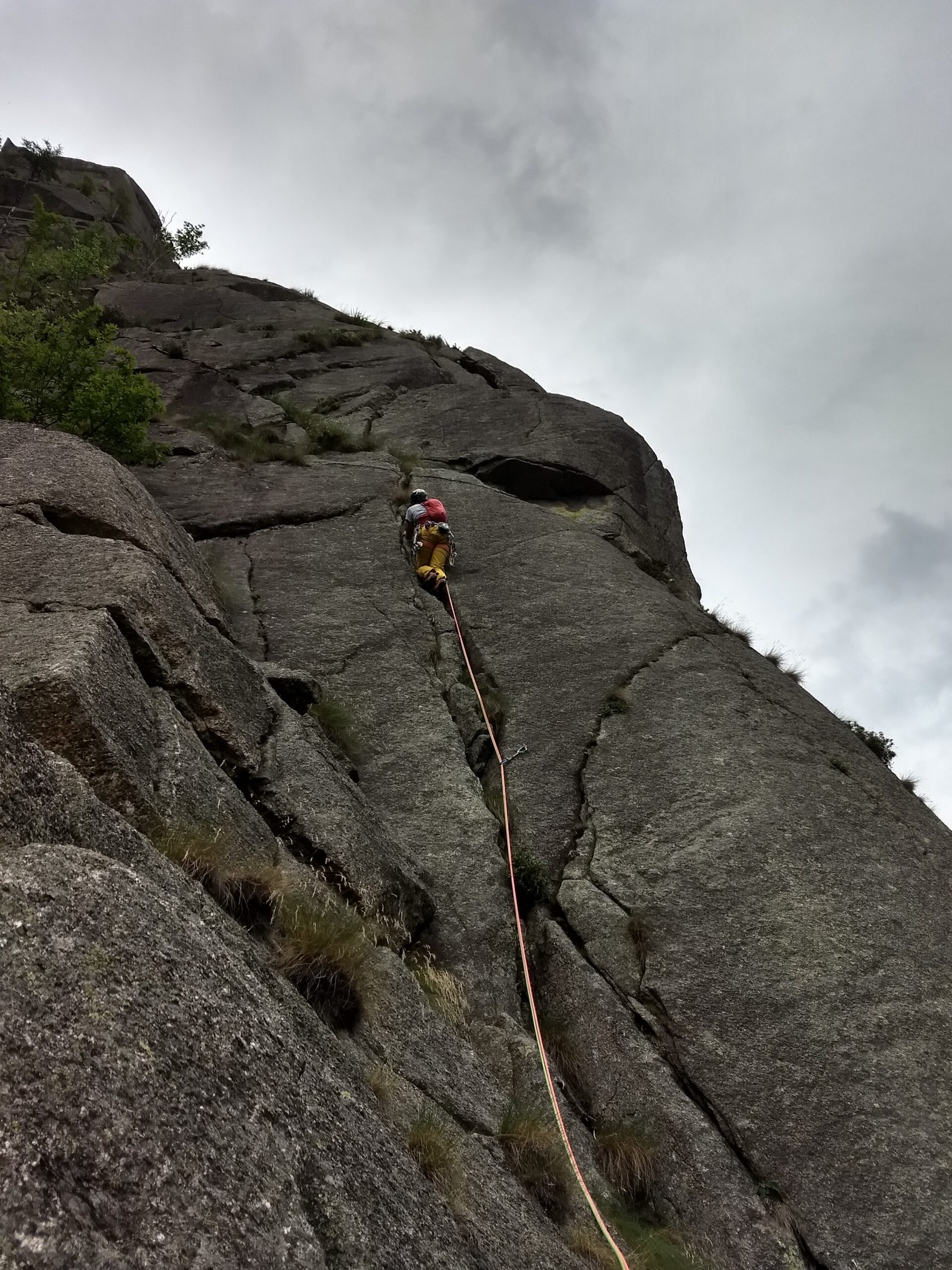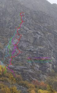 - L3 salire la fessura verso sx, alla piccola betulla seguire a dx la fessura di quarzo che conduce dopo un tratto verticale alla sosta con due spit e catena( da qui con corde da 60mt si arriva direttamente alla base della parete)5c
