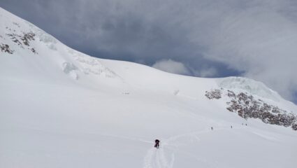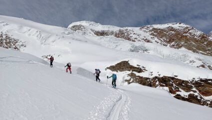 Partiti da Rivoli alle 5, alle 9 a Saas Fee, 15 minuti a piedi per la partenza degli impianti; saliti al Mittel Allalin (56 chf), siamo scesi sulle piste verso sx (ovest) fino a 3080 m. dove abbiamo attraversato lo skilift con le ancore per salire verso la cima fino a ricongiungerci con la traccia dalla Langflu Hutte. Ottime condizioni, pochi crepacci facilmente evitabili, non necessari neanche i coltelli. Discesa su fantastica neve polverosa recente, appena toccata dal vento sulla cima. Scesi al punto da cui eravamo partiti, abbiamo attraversato verso dx (est) fino a circa 2770 m., alla base della pista che scende dall’Egginerjoch. Risaliti al colletto, traverso con saliscendi per arrivare alla Britannia Hutte. Prima lunga giornata in Vallese con Francesco, Pierangelo, Giovanna, Daniele, Stefano e Mattia.
