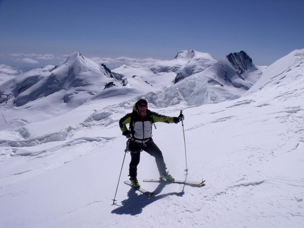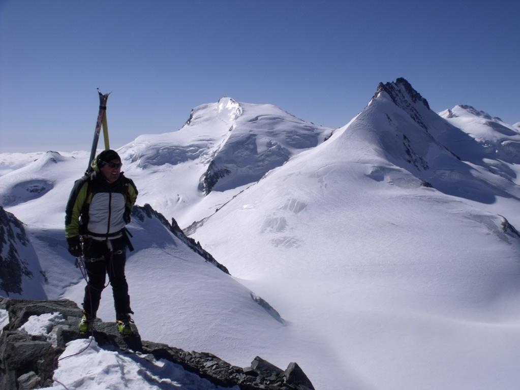 Dopo la salita all’Allalinhorn dal Feejoch calziamo i ramponi, ci leghiamo e sci nello zaino iniziamo la salita di questa breve e divertente cresta rocciosa che ci porta ai 3888 metri del Feechopf. Fortunatamente il vento non è troppo forte e le difficoltà sono modeste in ogni caso occorre procedere con attenzione in quanto scarponi da scialpinismo, ramponi e sci sulle spalle non sono il massimo per una scalata.