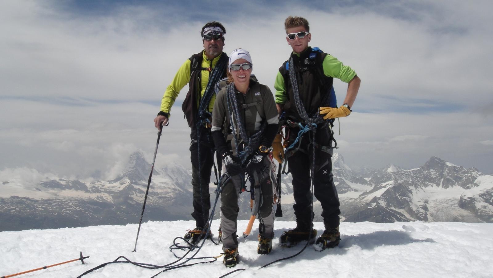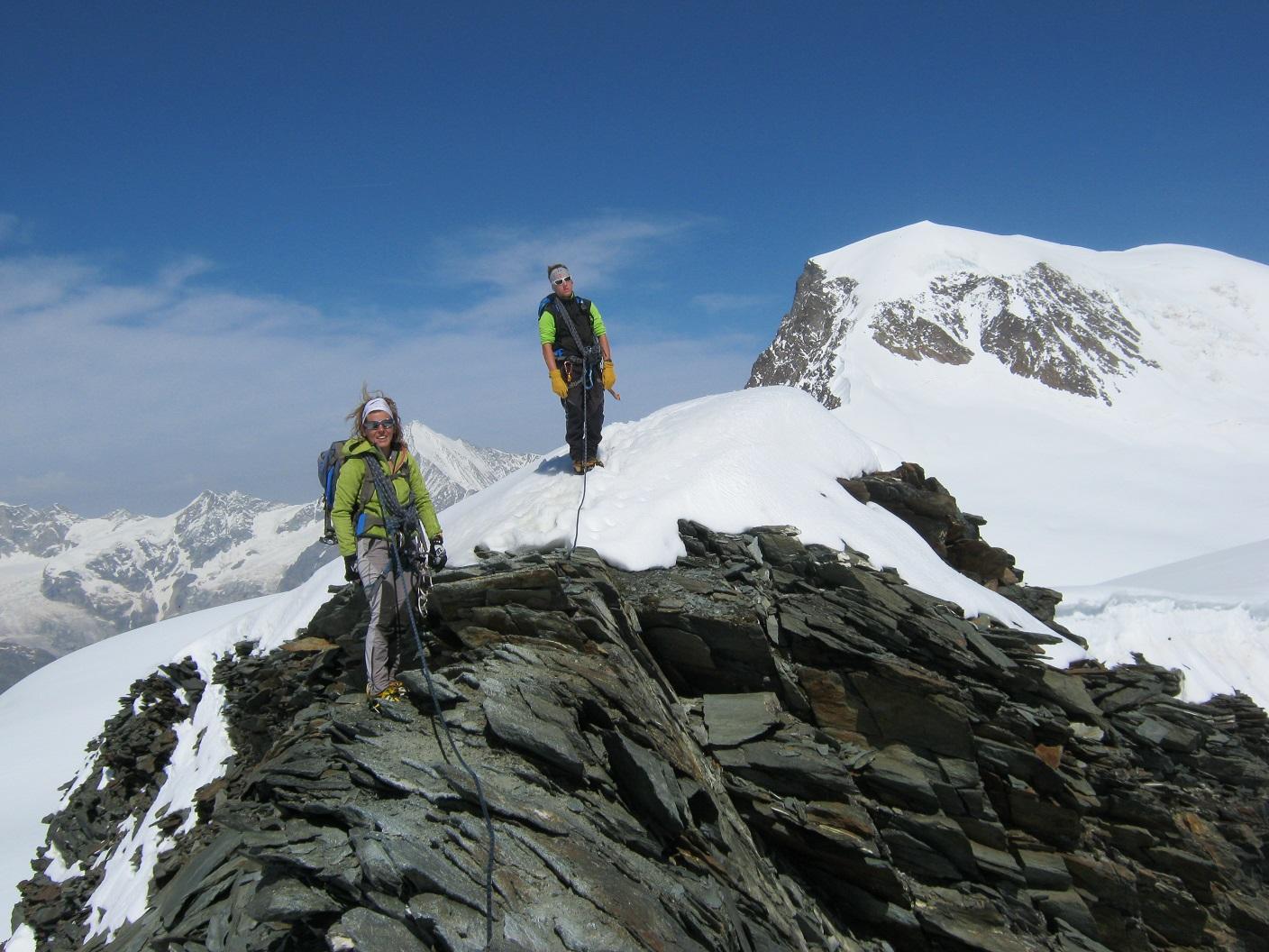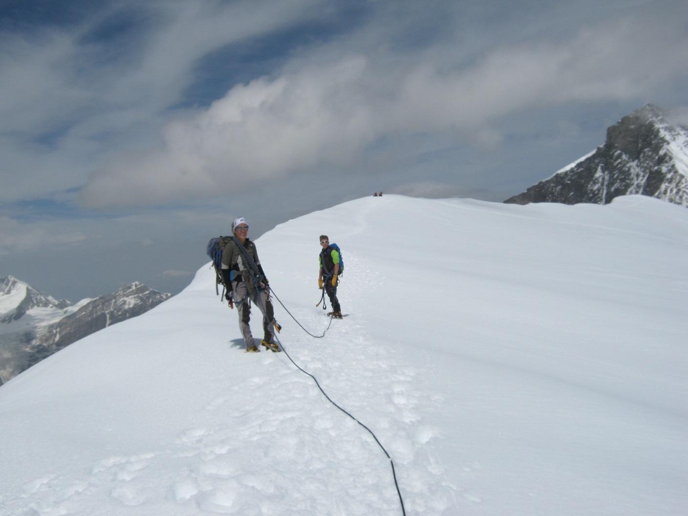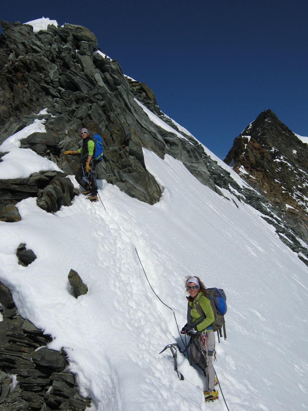 Dopo la salita all’Allalinhorn si va sull’Alphubel. Dalla sella del Feejoch inizia la cresta rocciosa che porta alla sommità del Feechopf. Cresta breve e non difficile che alterna brevi passi su neve a tratti rocciosi e pochi brevi passi di facile arrampicata, il tutto immerso in un ambiente veramente unico. Dal Feechopf scendiamo un centinaio di metri fino all’Alpubeljoch che, con una lunga traversata su neve un po’ molle porta al ripido pendio finale della dorsale dell’Alphubel. Si risale il pendio e siamo in vetta e i panorami meravigliosi intorno a noi ripagano veramente della fatica. Discesa su Lanflugh con bella traccia ma neve ormai molle e scivolosa, pochissimi i crepacci da attraversare. Arrivo alla stazione di Lanflugh e rientro in funivia a Saas Fee.
