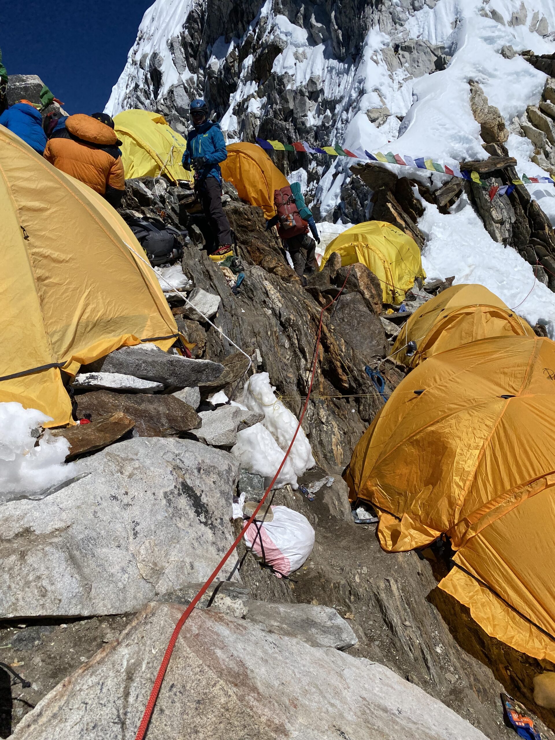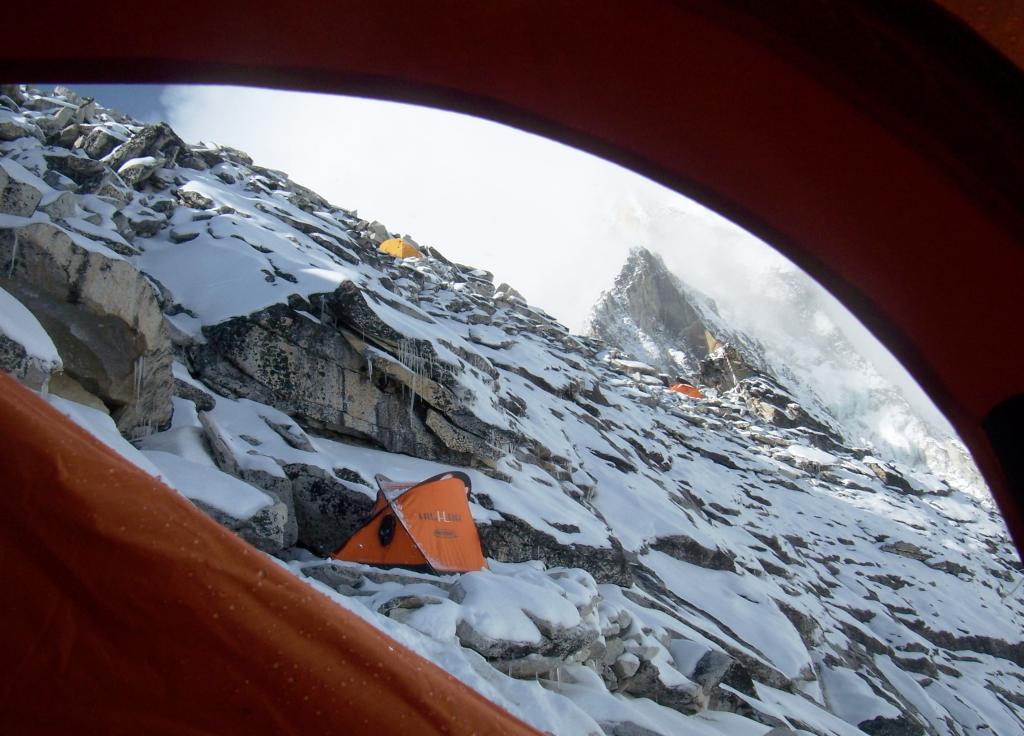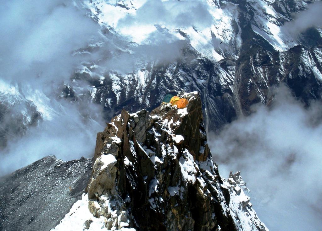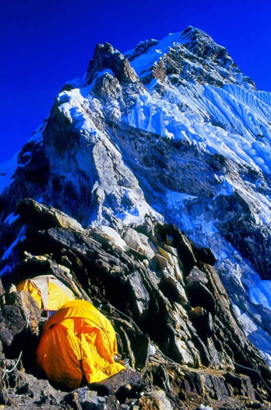 Dal campo base (4600 m) si sale per sentiero prima e per pietraia poi (ultima parte di salita su facili placconate, corde fisse) fino al campo 1 (5700 m), posto all’inizio della bellissima cresta sud-ovest. La salita è senza difficoltà ma comunque lunga, c’è eventualmente la possibilità di fare un campo intermedio intorno ai 5250 m di quota. Al C1 posto per tante tende.