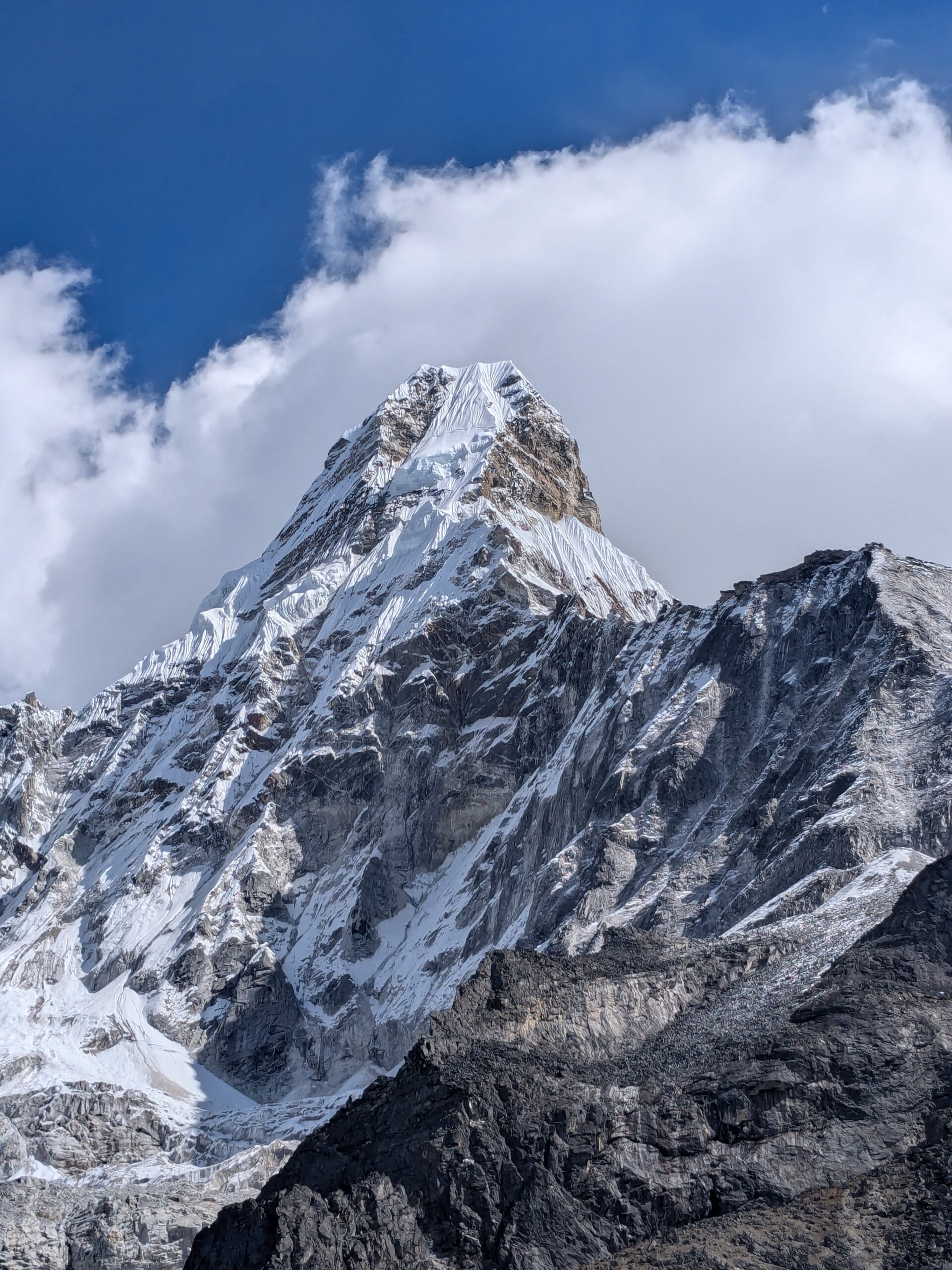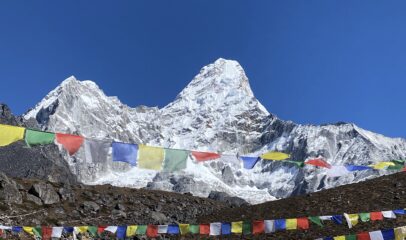 Da Lukla (2800 m) si sale a Namche Bazaar, quota 3400 m (possibile e comodo dormire la prima notte a Phakding 2650 m). A Namche utile giorno di riposo e acclimatamento, possibilità di fare un bel giro in zona fino ai villaggi di Khumjung e Kunde, e di salire con difficoltà escursionistiche al Kunde Peak (4200 m, poco frequentato). Tappa successiva Namche – Pangboche (3900 m). Da Pangboche si sale al campo base dell’Ama Dablam (4600 m). Possibile proseguire nel Khumbu e salire uno dei classici seimila facili (Island Peak, Lobuche East Peak) per poi tornare indietro e arrivare all’Ama Dablam meglio acclimatati.