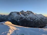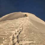 Dal campo 2 si scende brevemente a una sella e si sale poi lungo un couloir di misto che incide la Torre Grigia, si traversa quindi su neve verso sinistra e si risale poi un ripido canale nevoso. Qui inizia l’estetica sezione di cresta (Mushrooms Ridge) di misto e neve, molto aerea, che arriva al sito del C3 (6250 m, posto per pochissime tende). Se ben acclimatati la cima si fa bene direttamente dal C2. Si sale ora la parete sommitale della montagna, la prima parte sui 40-45° fino ad aggirare più ripidamente sulla destra l’enorme seracco, la seconda parte con pendenze più sostenute (55-60°), fino al sollievo della spianata della vetta.
