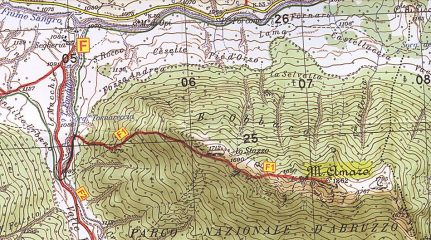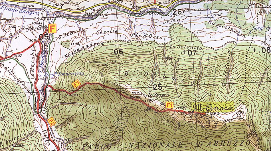 Si ritorna ora verso nord lungo il torrente per alcune centinaia di metri, quindi si segue la deviazione sulla destra (sentiero F1) che sale con numerosi, ripidi e stretti tornanti nel bosco di faggio tenendo prevalentemente la cresta ONO.