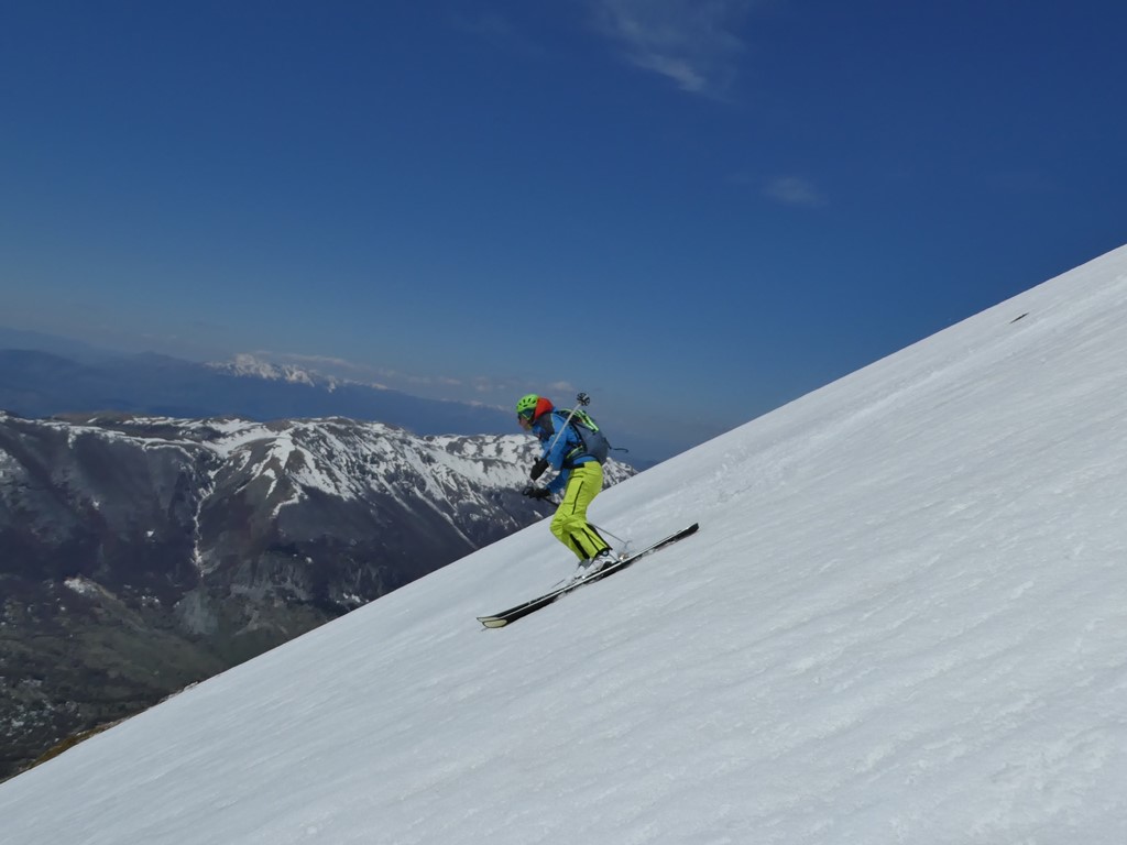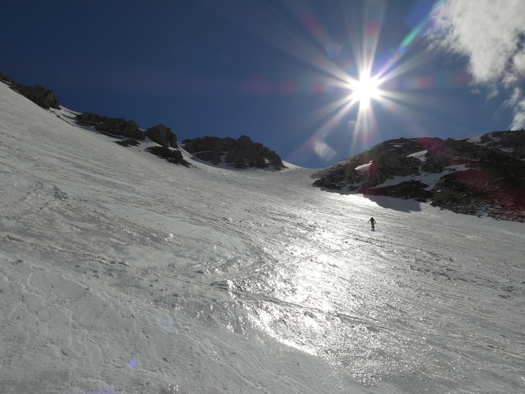 In cima tramontana forte e gelida, provvidenziale il bivacco di vetta per il cambio assetto. Discesa per la direttissima su neve compatta con un pò di farinella in alto, poi trasformata con tratti di firn molto belli sulle expo dove il sole aveva già fatto il suo dovere: noi ci siamo gradualmente spostati sulla dx. orografica trovando lenzuoli intonsi (la discesa centrale è abbastanza segnata dai passaggi precedenti).