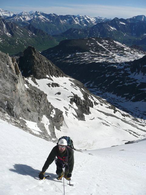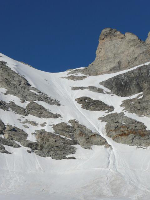 Abbiamo dormito in tenda circa un chilometro prima del lago (oltre molta neve). Nottata e giornata fredda e ottimo rigelo notturno. Partiti con i ramponi dal punto di bivacco. Pendio canale in ottime condizioni con terminale visibile ma con ponte di neve robusto. Siamo poi saliti sul dente meridionale solo grazie all’ottima prestazione di Andrea da primo sul passaggio chiave obbligatorio di quarto grado (altrimenti con cavolo che ce lo toglievamo il dente…). In discesa, visto il buon innevamento e l’ottima tenuta della neve, siamo discesi dal nodo di confine direttamente verso SE, per ripidi pendii e canali, ma poi abbiamo ravanato non poco per riuscire a raggiungere il Col Clapier, causa la presenza di ripugnanti salti di roccia poco sopra il rio Clapier.