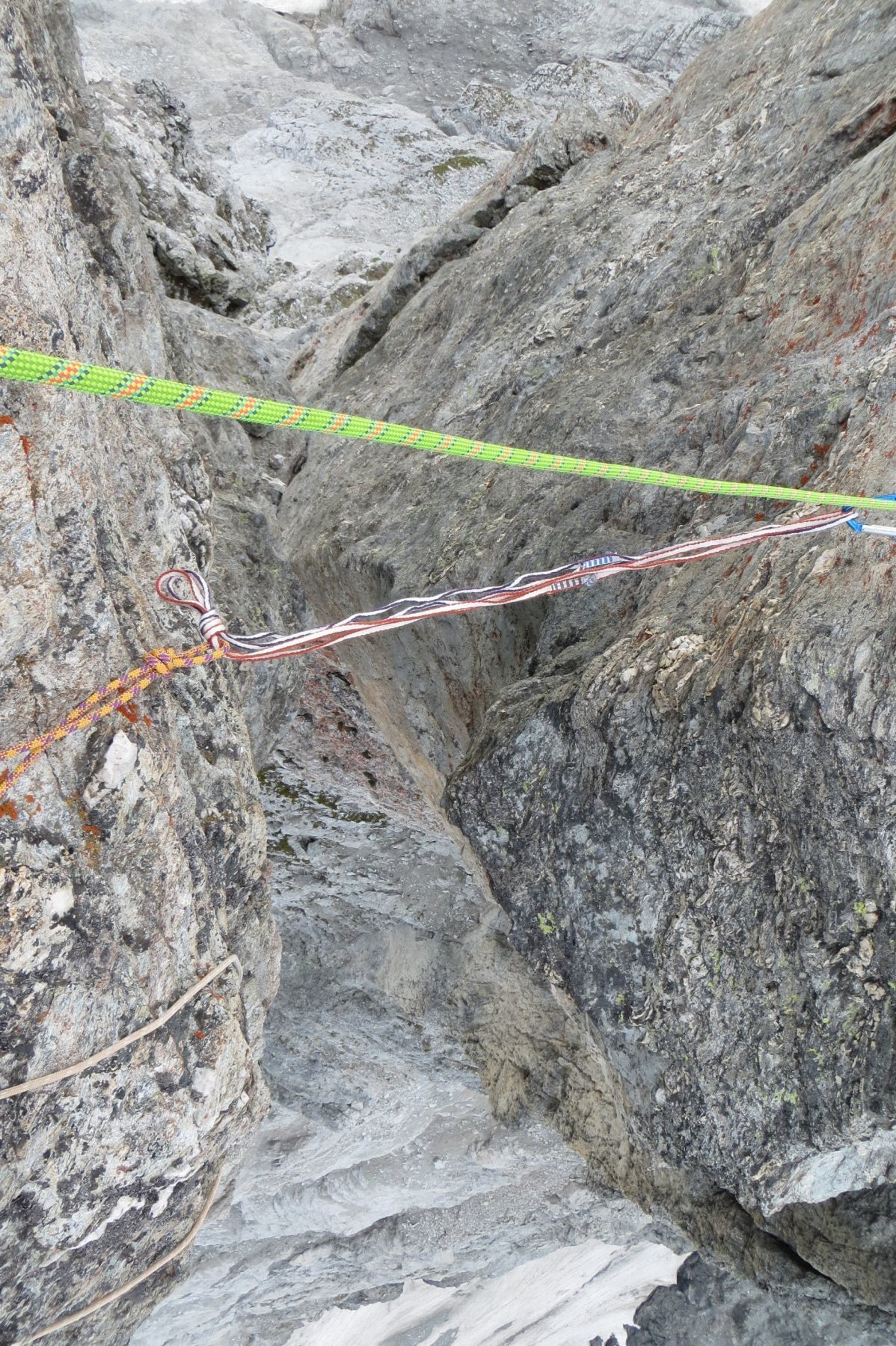 Scendere 2m nella strettissima forcella successiva (Coup de Sabre), superarla con spaccata molto esposta e salire la placca successiva (un passo di IV), quindi un muretto a dx del filo (III, cordino) fino ad una sosta (2fix+cordone) su un terrazzino a dx del filo. Qui ci sono due possibilità: a) superare il salto verticale inproteggibile sopra la sosta (3m, V), tornare sul filo, toccare la spalla del dente nord e raggiungere facilmente per cresta il colletto alla base del salto finale (sosta 2fix+cordone); b) scendere uno stretto camino (altra sosta 2fix+cordone alla base) e traversare in discesa verso sud sul versante ovest per placche inclinate e una cengia poco marcata fino alla base di un ampio camino che si risale per placche via via più ripide fino al colletto alla base del salto finale (III-IV, diversi chiodi).