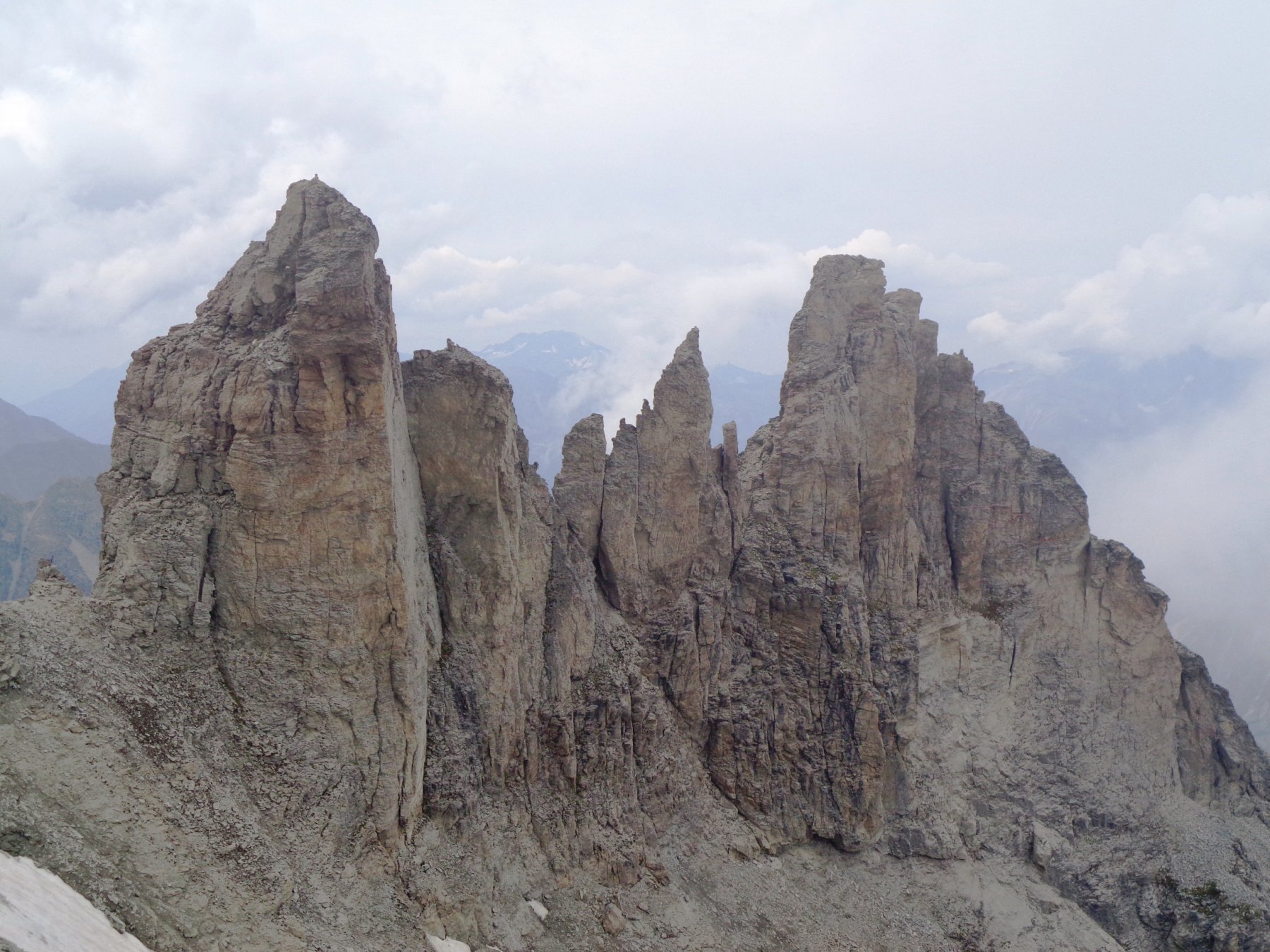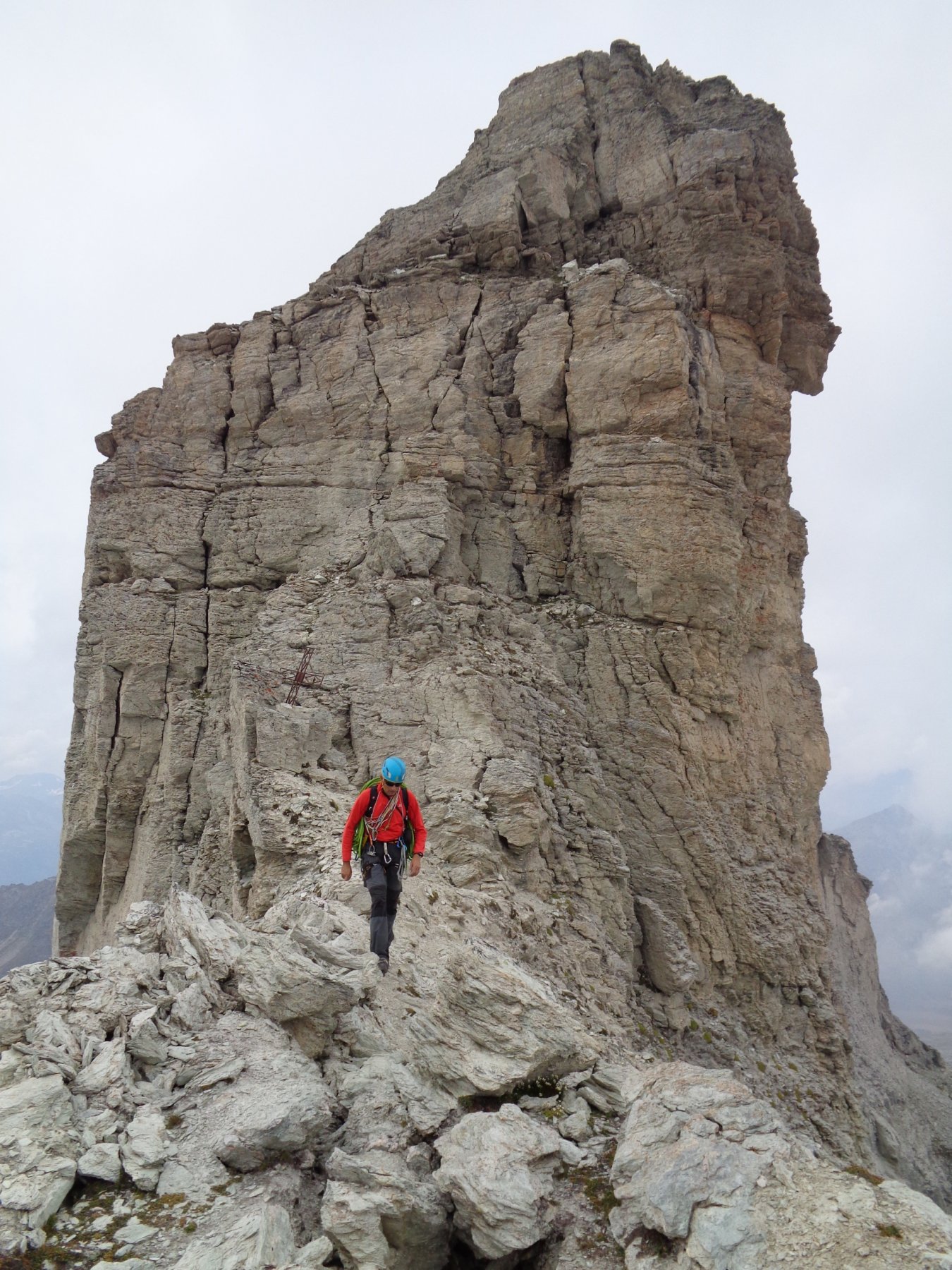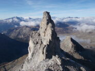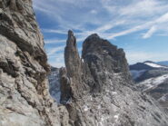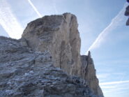Ritornati alla cengia detritica, la si segue fino al colletto fra il dente centrale e il dente sud che si raggiunge seguendo la cresta nord sul filo fino in vetta (II, un passo di III esposto poco prima della cima), oppure, più facilmente, traversando all’ultimo verso dx per raggiungere la cresta ovest e con questa la cima.