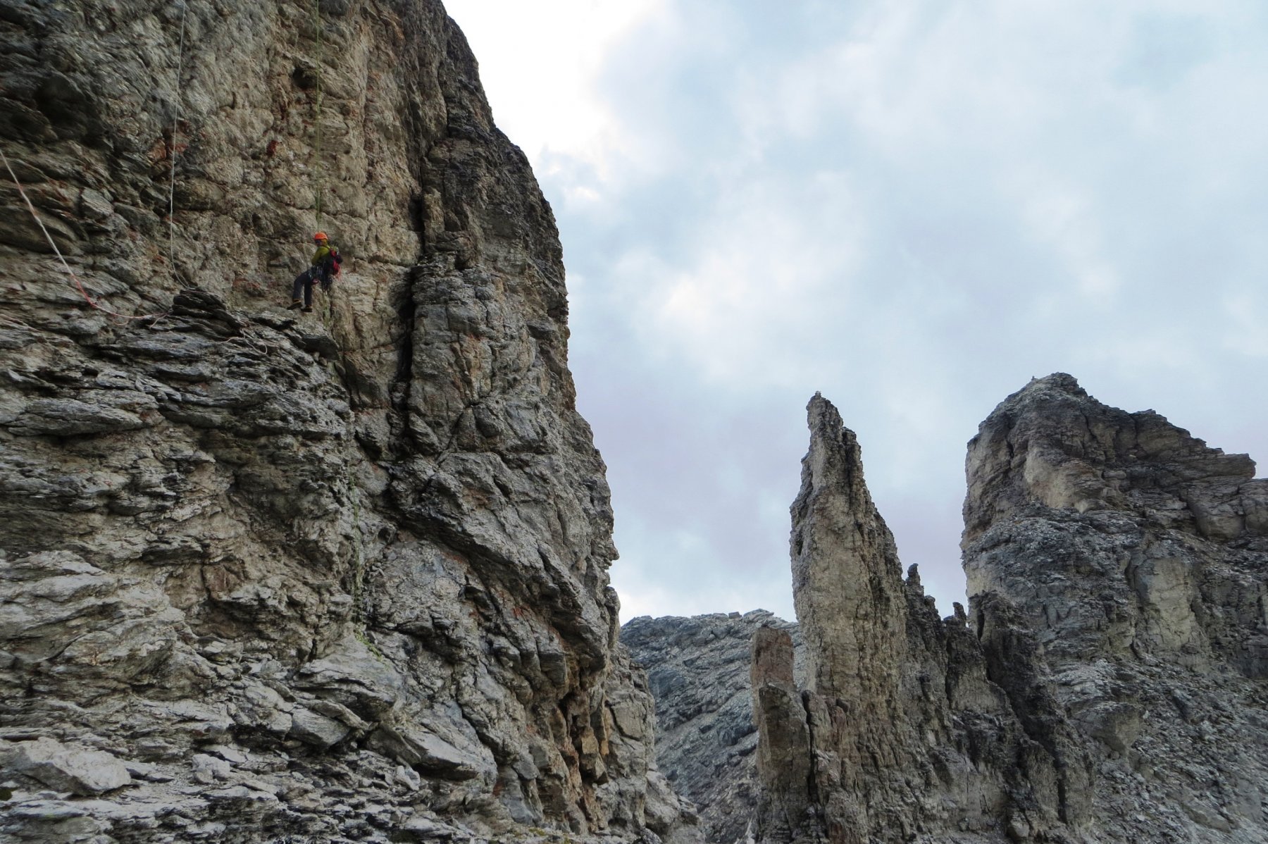 Si segue la cengia in leggera discesa, quindi si rimonta fino alla base del versante ovest del dente centrale, raramente salito per la mediocrità della roccia. Si attacca il versante ovest da sx verso dx per rocce un po’ malsicure e si raggiunge la cresta sud nei pressi di due gendarmi (cordoni). Si raggiunge quindi una forcellina a monte di questi (chiodo) e si rimonta l’ultimo tratto quasi verticale non lontano dal filo (III+ poi più facile), quindi sul filo (cordino) fino all’esile cima (sosta 2fix+cordone). Per la discesa si può fare una sola doppia sul fianco ovest direttamente dalla vetta (corda da 60m, rischio di incastro), oppure una prima calata diagonale fino al primo gendarme dopo il chiodo e una seconda da questo.