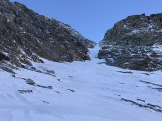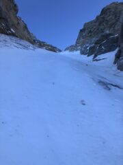 Condizioni finalmente accettabili ma lungi dall’essere ideali, visti i lunghi tratti di crosta poco portante alternati a tratti compatti e con buon rigelo. La parete nord è al momento più un canalino, ma si passa ancora bene.