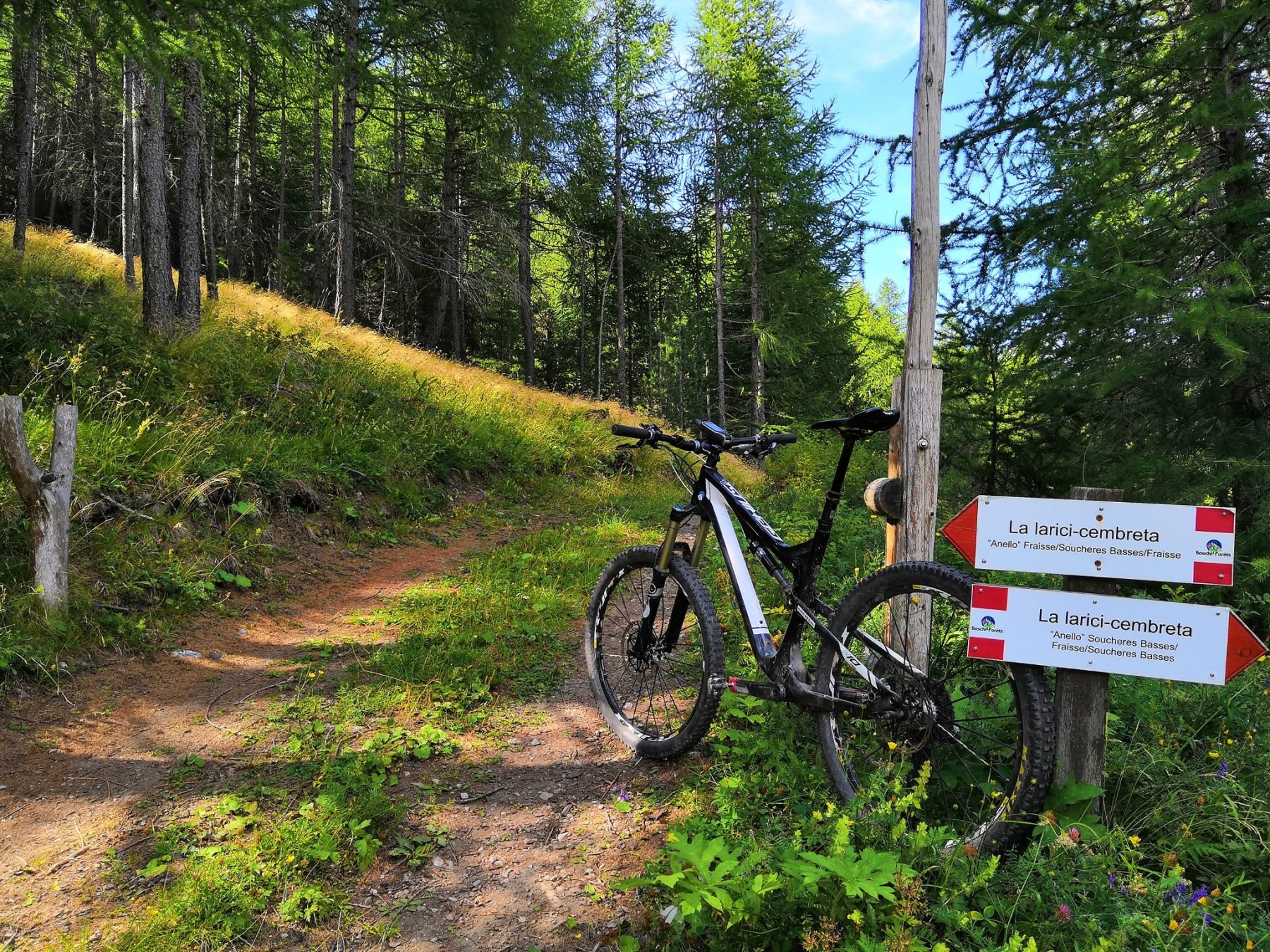 Si parte da Pourrieres scendendo dalla statale al bacino, si prosegue in direzione Fraisse facendo attenzione a superare il torrente Chisone grazie ad un guado in pietra e si giunge ad una bacheca con indicazioni per l’anello “larici-cembreta”, proseguiamo la salita che con diversi tornanti sempre ben pedalabili ci fa guadagnare quota fino ad arrivare ad un tornante a destra dove sono presenti una sbarra in legno e altri cartelli che segnalano il percorso.