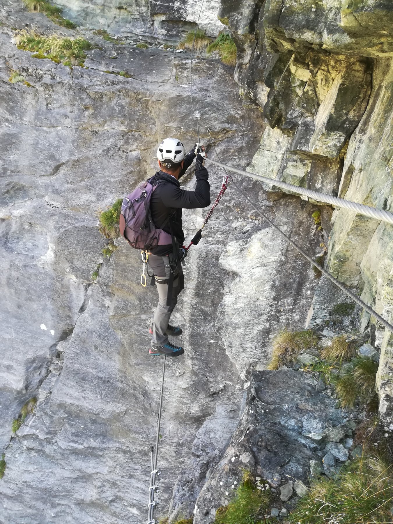 (200 m. di dislivello) all’attacco. Dopo un inizio tranquillo, un simpatico camino e muri sempre verticali, si arriva ad una cengia erbosa, che collega, con tre passi in discesa nello strapiombo, ad un ponte delle scimmie con tre cavi. Si continua su cenge e muri verticali, aerei e talora strapiombanti ma mai faticosi fino all’uscita su una zona pratosa. Si ritorna con sentiero sulla destra e in 45 minuti si ritorna al parcheggio. La ferrata essendo esposta a Nord, và percorsa in giornate molto calde come oggi, altrimenti nel pomeriggio quando la parete prende un pò di sole.