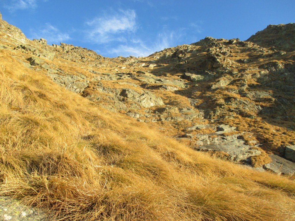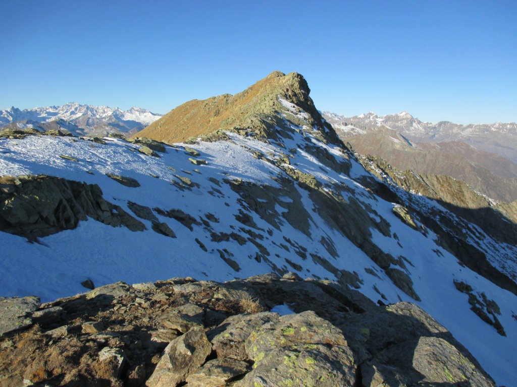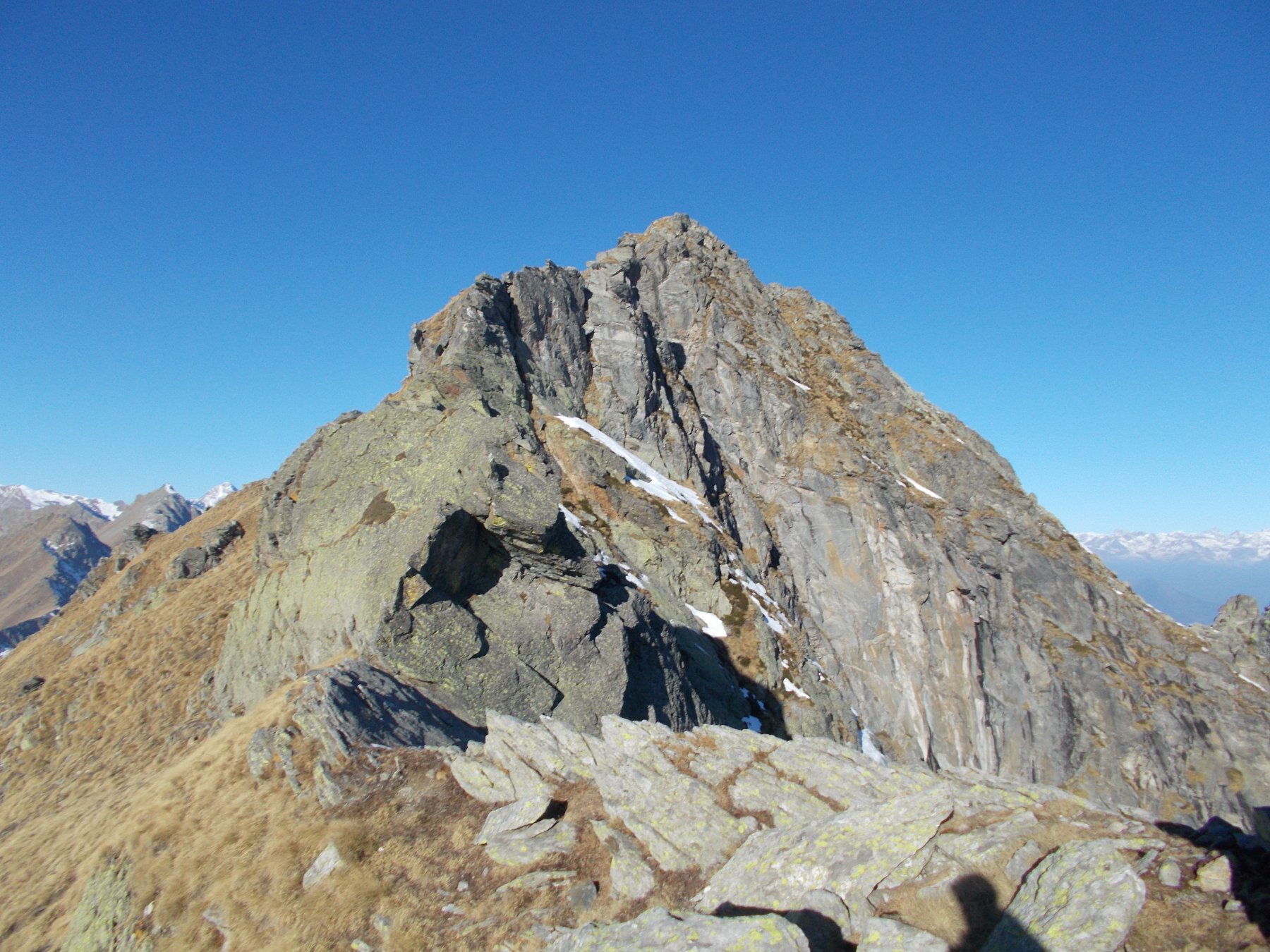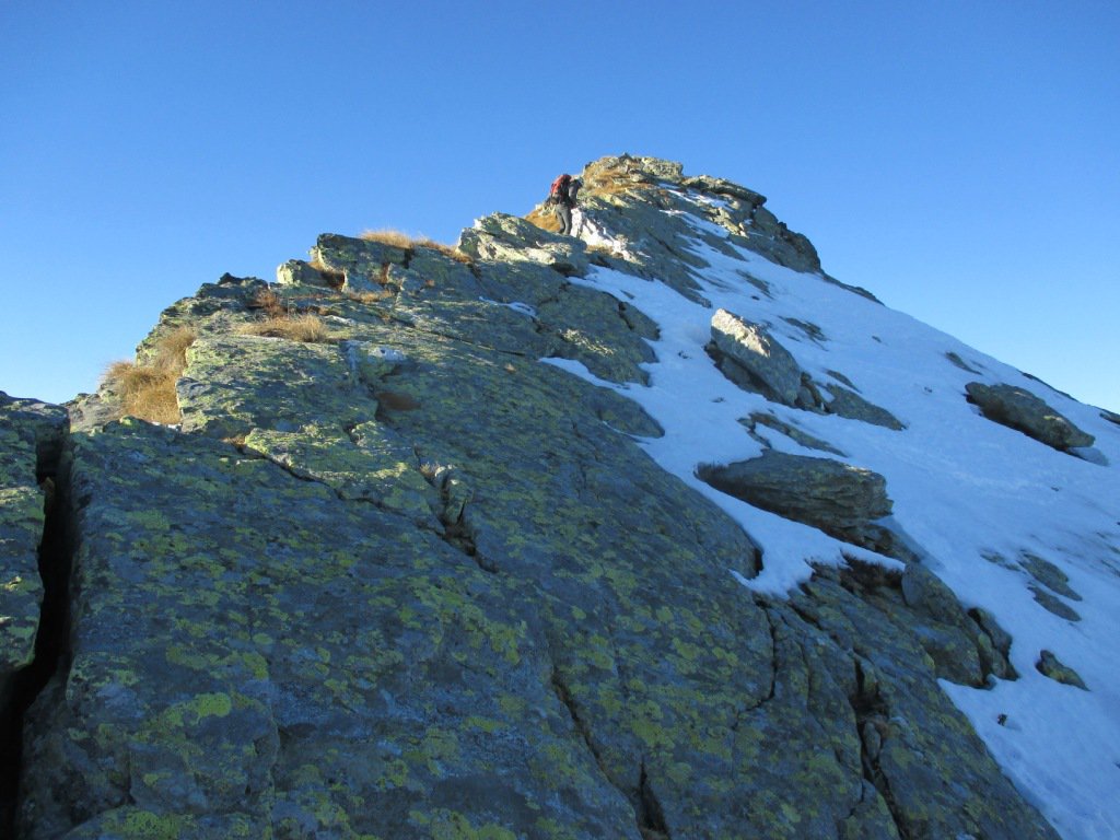 Dalla cima del Monte Vailet, proseguire il percorso di cresta verso est, su magre tracce di animali, si aggirano i primi spuntoni rocciosi abbassandoci di qualche metro sul versante valdostano, si giunge ad un stretto intaglio, ora si aggira a sud, su magra traccia fra l’erba olina e si guadagna la sommità risalendo sempre su erba un brevissimo canalino, su terreno esposto.