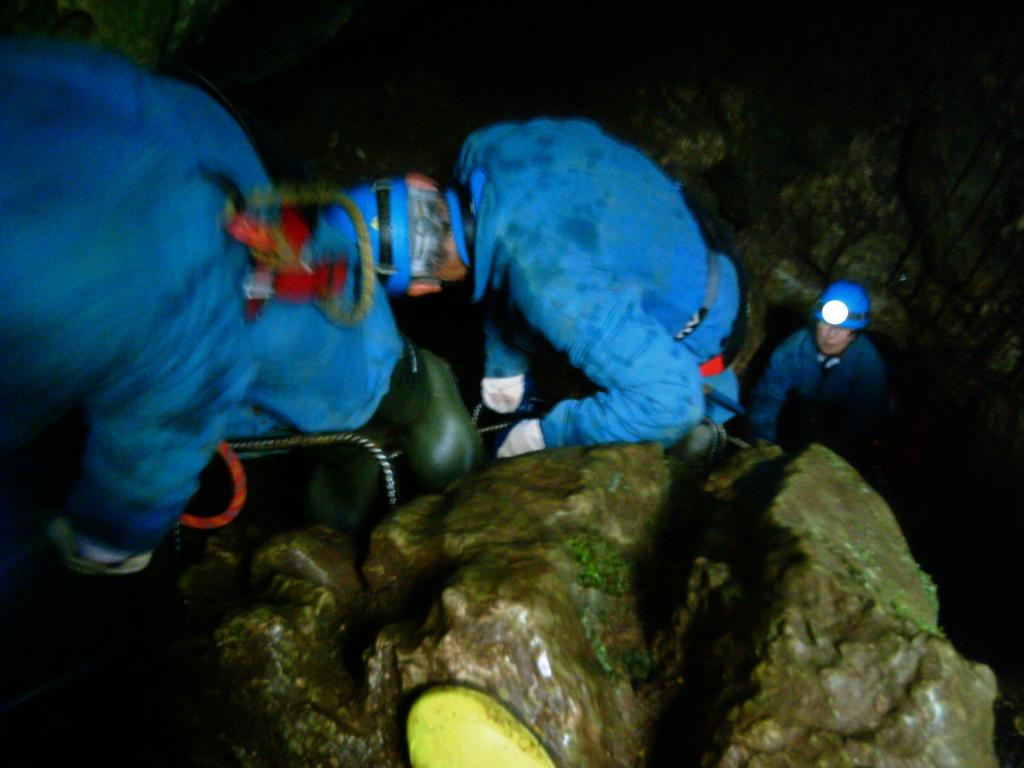 Dall’ altra parte del ponte si entra in una sala piena di curiose concrezioni da ammirare.La grotta si restringe ulteriormente fino a dover strisciare sulla schiena per proseguire. Un nuovo pozzo che si attraversa con una passerella di 15 metri, altra sala con un ponte delle scimmie, dopo una scivolata di circa 15 metri, si arriva sull’ ultima sala che si risale fino all’ uscita per mezzo dei gradinia attrezzati in alcuni tratti un pò tira braccia.