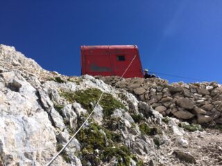 Poco dopo troviamo la via ferrata (PD) che percorre tutto il traverso (intercalato da diversi sali e scendi) arrivando al sospeso bivacco, vero e proprio nido d’aquila (1 h). Panorama eccezionale.