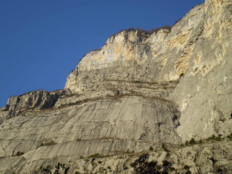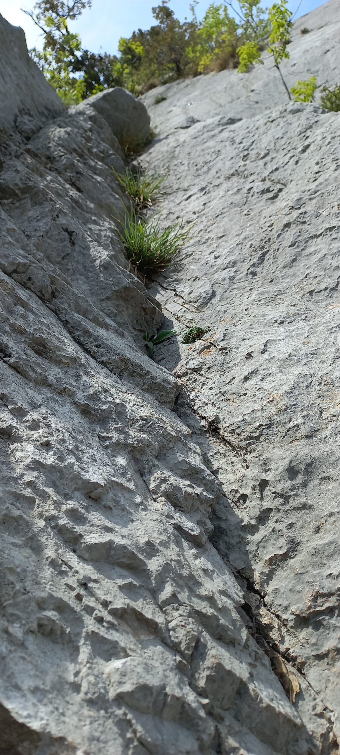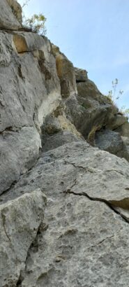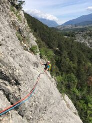 superare un muro verticale di 3 metri a destra della sosta. Traversare a sinistra per altri 3 metri e poi rimontare la placca sovrastante obliquando a sinistra verso la sosta. 30 Mt., VI°-, VII° oppure A0, V°-, 3 spit, 1 clessidra con cordone.