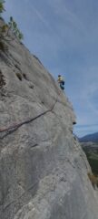salire in verticale fino a raggiungere una lama sulla destra che consente di guadagnare rocce più facili. Tramite queste si raggiunge una seconda lama che conduce in sosta. 35 Mt., V°-, V°+, 4 spit, 1 clessidra con cordone.