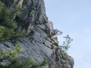 traversare a destra, salire il diedro obliquo sino al suo termine poi attraversare per facile cengia verso destra sino alla sosta su pianta.