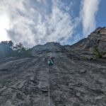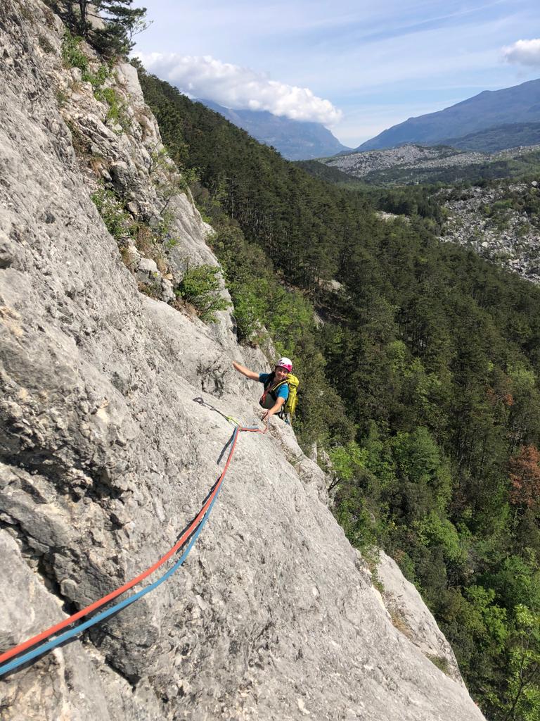 traversare a destra sulla placca (molto liscia) che richiede un’arrampicata tecnica e delicata fino allo spigolo. Da qui per facili rocce si raggiunge un’altra placca alla cui sinistra si trova un diedrino. Salire per quest’ultimo sino alla sosta.
