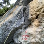 traversare a destra e superare uno strapiombino, indi obliquare a sinistra sino a raggiungere un canalino. Da qui traversare a sinistra sino alla sosta. 40 Mt., V°-, IV°, 4 spit, 1 chiodo.