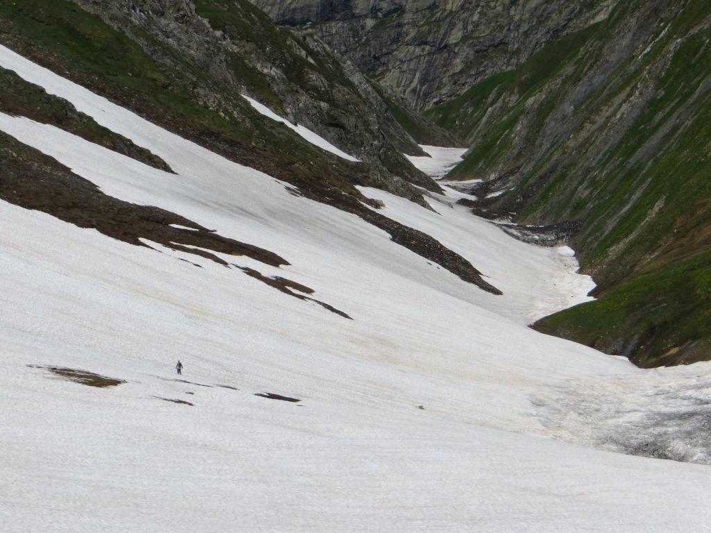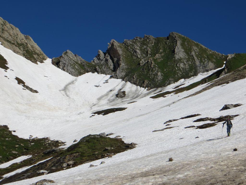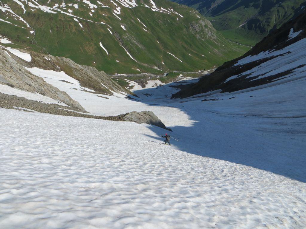Scendere (neve sicura!) in direzione nord,versante Svizzera,il sostenuto pendio-canale fino a raggiungere il fondo del grande vallone Ban Darray alla quota 2200 m. circa al Plan Vès.