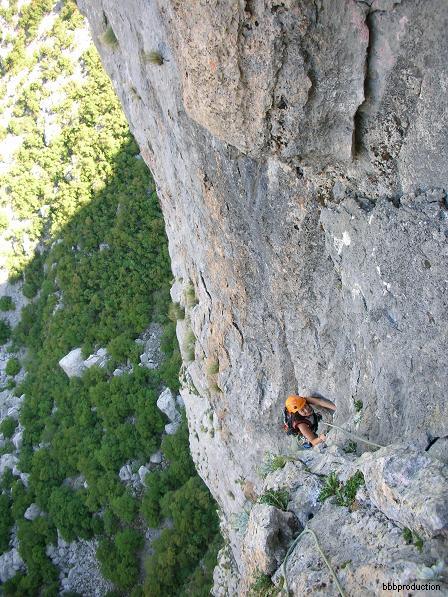 - L10: facile a sx poi muro più duro e quindi su cannelures pazzesche, sosta su enorme clessidra da allestire, tiro lungo 1 spit, IV;