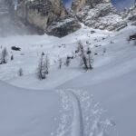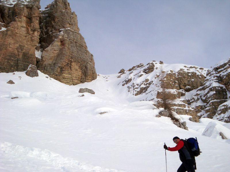 Dal parcheggio del Rifugio Scoter si parte seguendo la strada al 2° tornante, fino alla congiunzione con il sent. 227 che porta ad una sella ed alla Forc. Piccola 2120 mt. Dalla forcella Piccola svoltare a sud e portarsi sotto il vallone nord del Monte Antelao. Risalire il catino fino all’angolo più in alto a destra, a ca.2500 mt.
