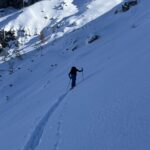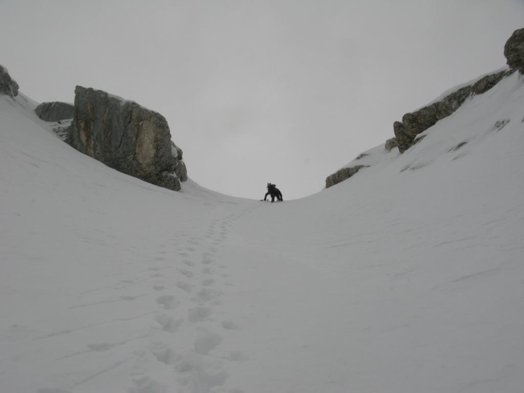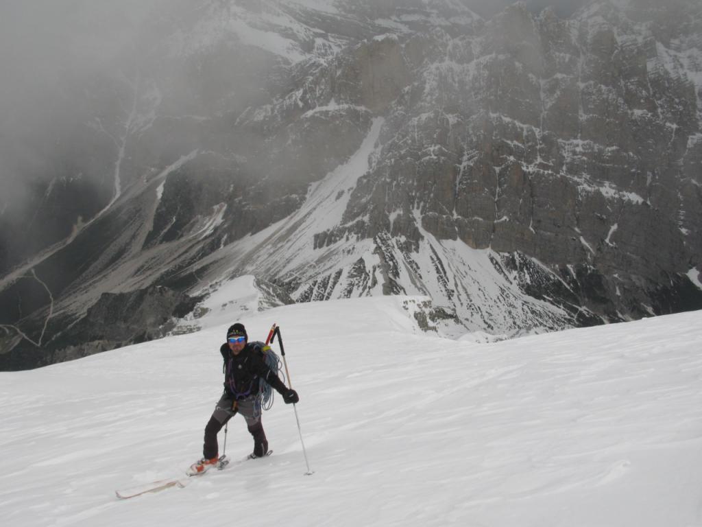 Si risale quindi la seconda lastronata fino a raggiungere il Bivacco Cosi 3111 mt (di solito sepolto dalla neve) dove termina il percorso scialpinistico.
