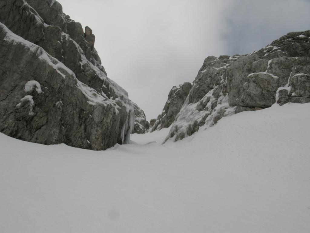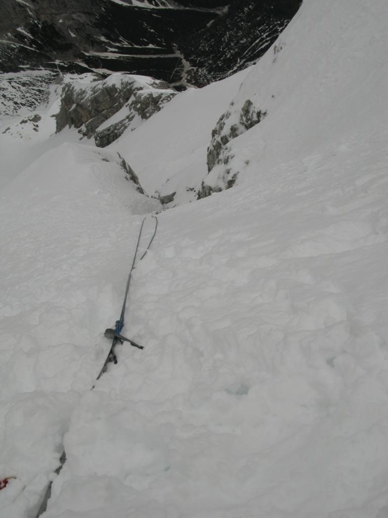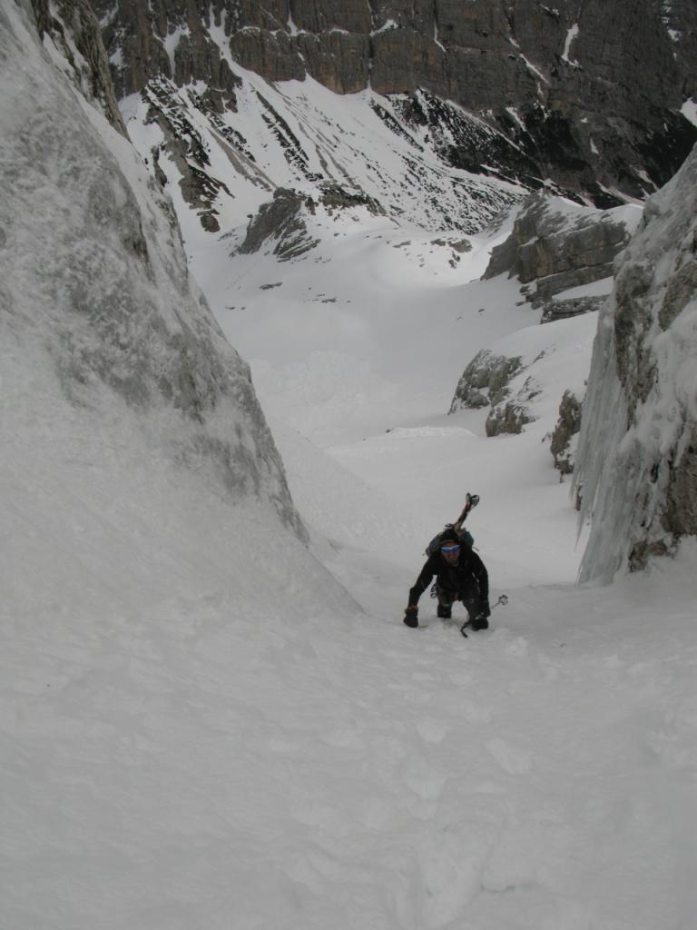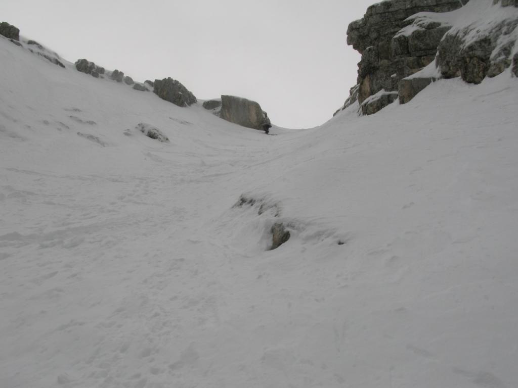 Da qui si procede diritti in forte pendenza, poi in obliquo a sinistra fino a portarsi sotto al Canalino Antelao 45-50°(detta ”Variante Lindemann” da fare con ramponi e picozza). Raggiunta la sommità del canalino si deve uscire a sinistra. Da qui si comincia a salire per la lastronata inferiore, con pendenza intorno ai 25° fino all’inizio della seconda lastronata che si raggiunge attraverso un secondo canale che si impenna nel finale fino a 40°.