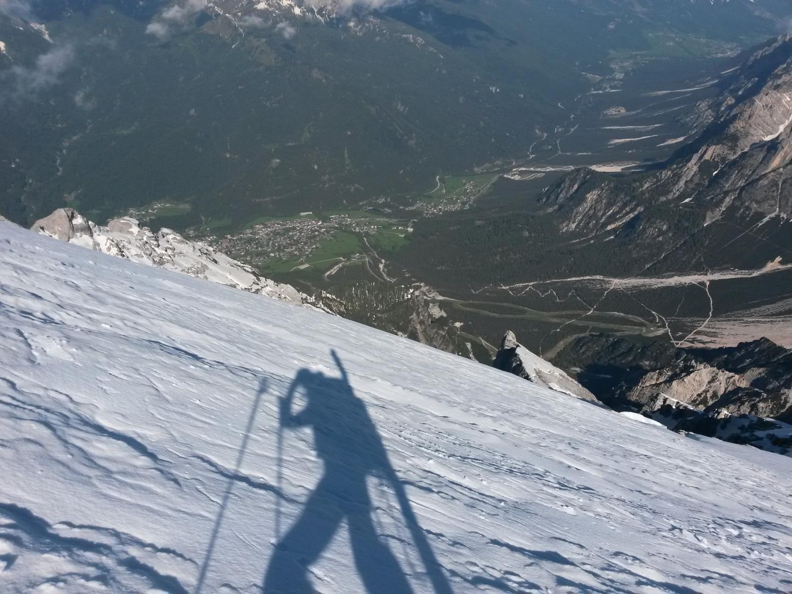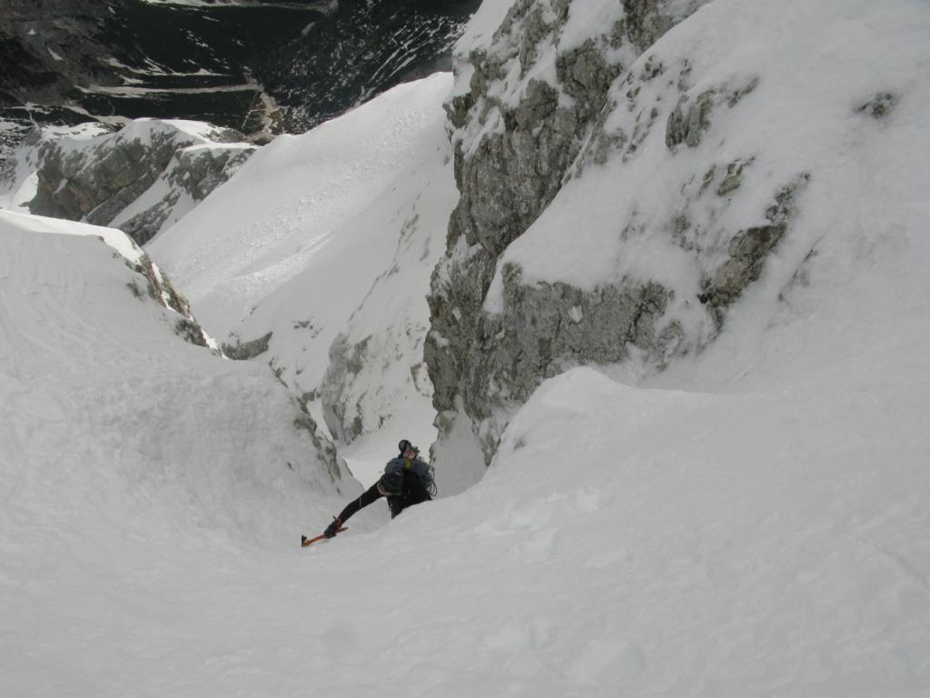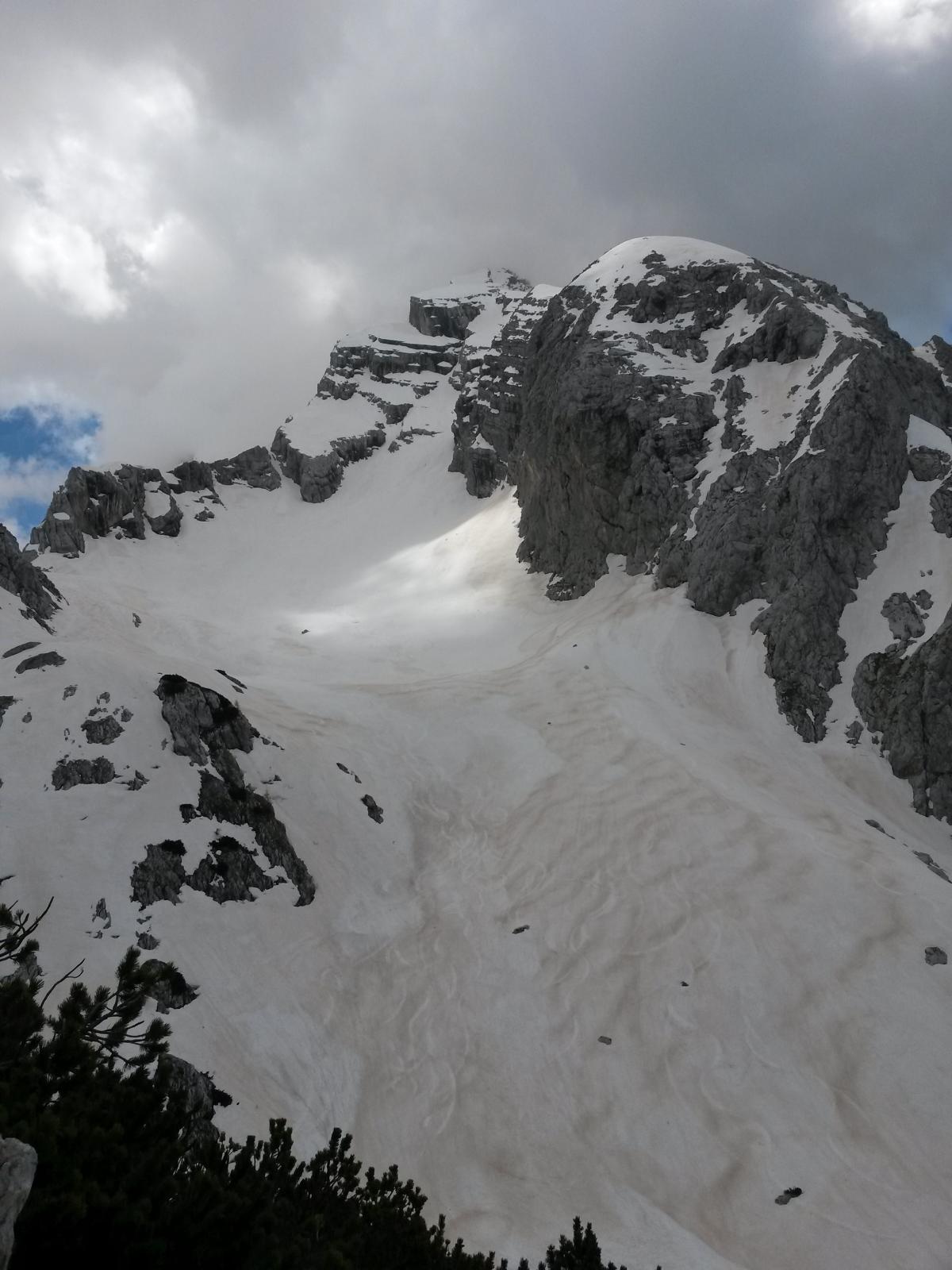 Da qui si procede diritti in forte pendenza, poi in obliquo a sinistra fino a portarsi sotto al Canalino Antelao 45-50°(detta ”Variante Lindemann” da fare con ramponi e picozza). Raggiunta la sommità del canalino si deve uscire a sinistra. Da qui si comincia a salire per la lastronata inferiore, con pendenza intorno ai 25° fino all’inizio della seconda lastronata che si raggiunge attraverso un secondo canale che si impenna nel finale fino a 40°.