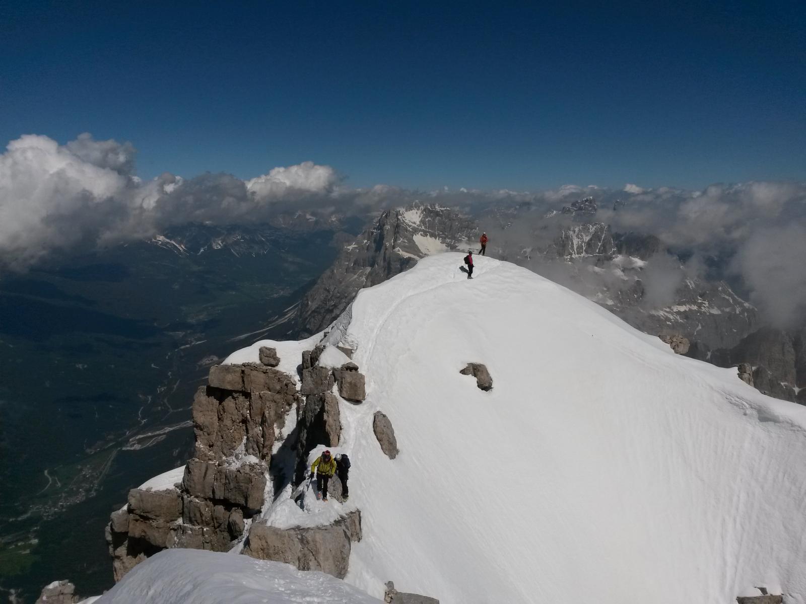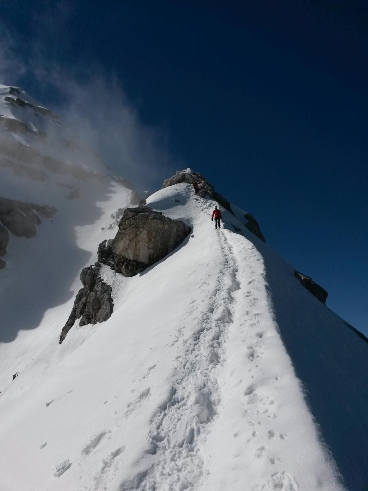 Dal bivacco proseguire a destra tutto in cresta fino a sotto la vetta, con passaggi molto esposti. Questo tratto finale di misto necessita di neve molto stabile, ed è raramente percorribile in inverno.