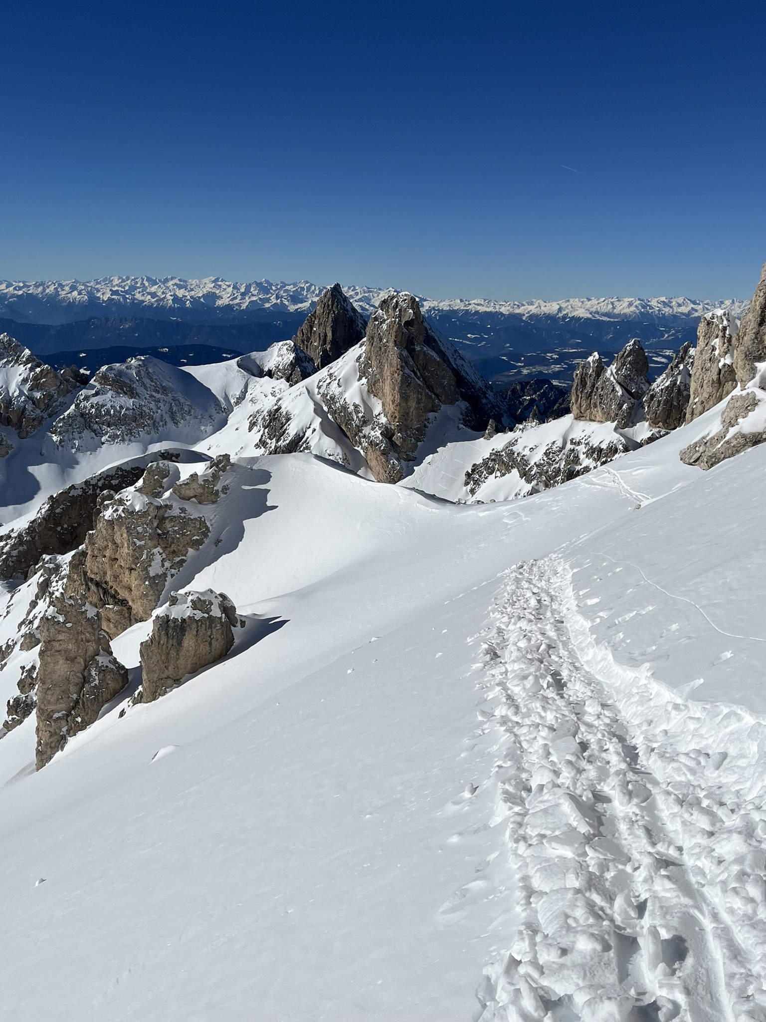 Dalla partenza della seggiovia a Pera di Fassa si segue il sentiero estivo più o meno parallelo alla seggiovia fino ai piani di Peciè, dopo di che si prosegue su stradina battuta fino al rifugio Gardeccia, poi sempre seguendo il vallone, il rifugio Vajolet, quindi poco prima del rifugio Principe si devia decisamente a destra verso l’evidente forcella (quota 2790). Da li si prosegue con qualche saliscendi verso la valle Duron, quindi a Campitello di Fassa dove si trova un autobus per tornare alla partenza.