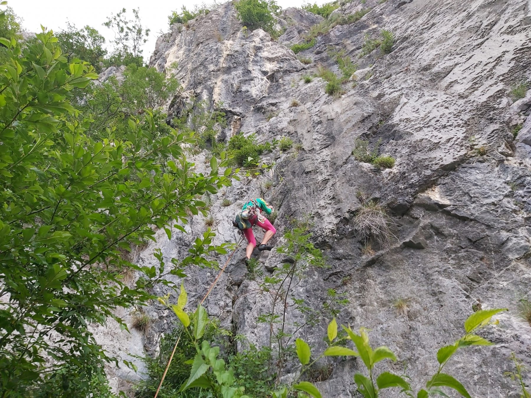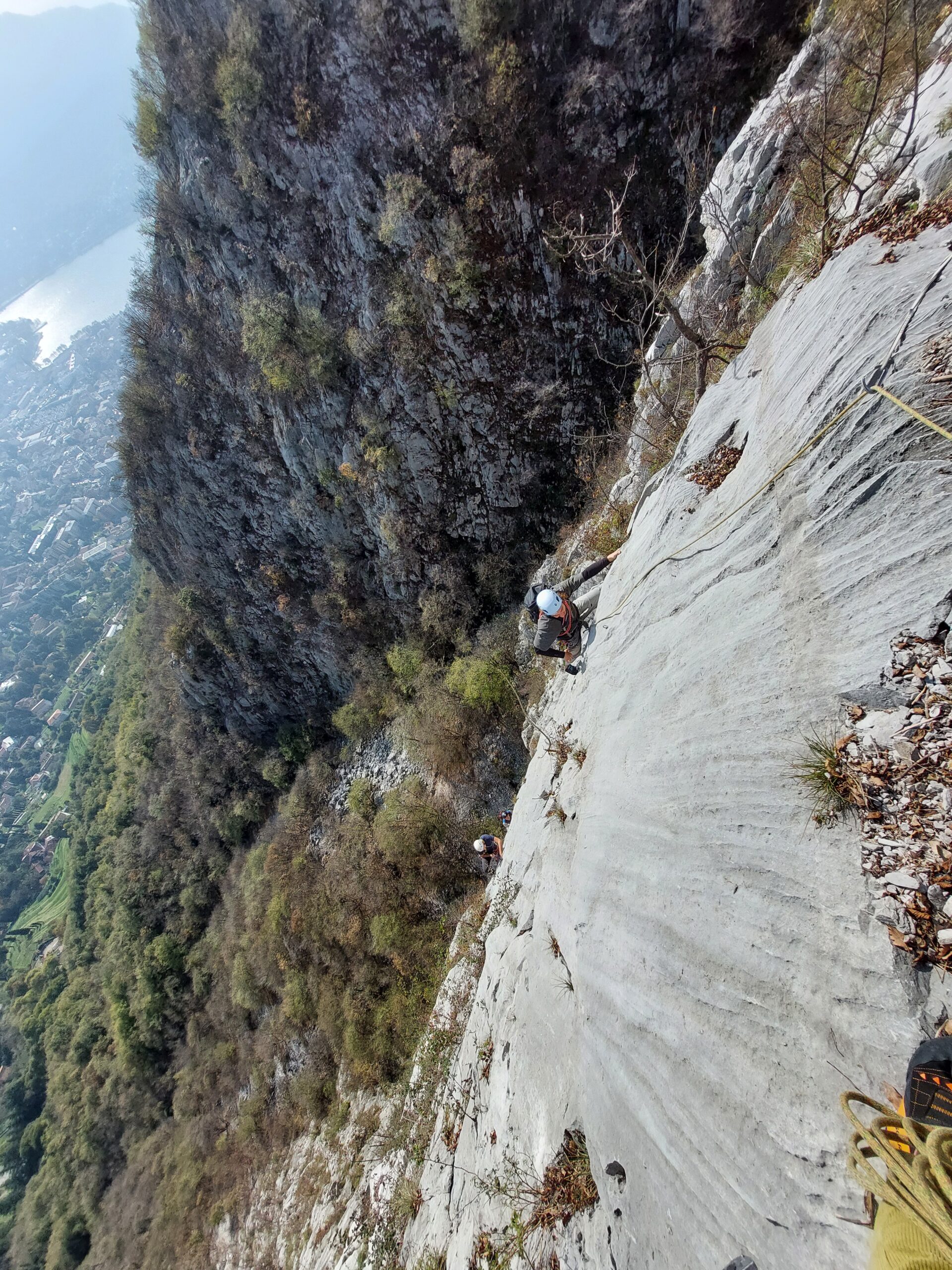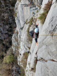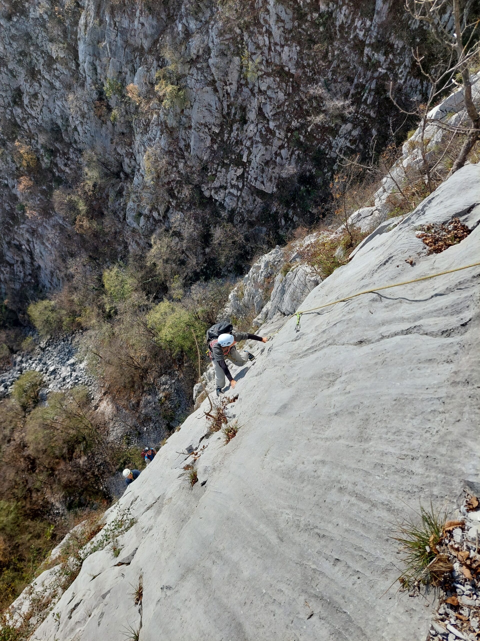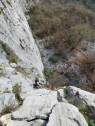 Discesa: a piedi. Dall’ultima sosta si sale drittiuna decina di metri per roccette (II+), sfasciumi e arbusti, fino ad incrociare il sentiero che attraversa la cima della parete verso sx faccia a monte (corde fisse), per poi calarsi nel canale a sx della struttura e tramite esso alla base della parete. attenzione ai sassi!