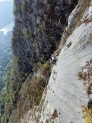 - L2: qualche metro ancora fino alla fine del diedro, poi per facili placche in direzione di un resinato. Da qui tra versare a dx su placca esposta ma facile e continuando in traverso a dx raggiungere la sosta su terrazzino erboso. 4b