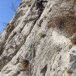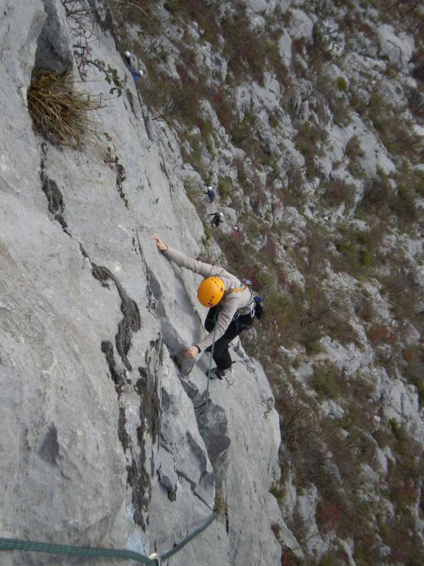 L6: (collegabile alla precedente: consigliato). Dalla sosta, dritto per placca fino a congiungersi con la via degli istruttori. se ne risale l’ultimo diedro, purtroppo molto unto, ma non difficile, fino alla sosta. 5c/6a