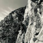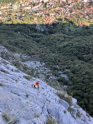 L3: tiro chiave: vinti i primi metri della placca, si traversa a dx per entrare nel diedrino. Si sale faticosamente il diedrino in opposizione (qualche passo un po’ scivoloso) per uscire sulla placca sovrastante. Ancora qualche movimento in fessura fino alla sosta. 6a+