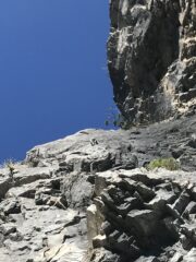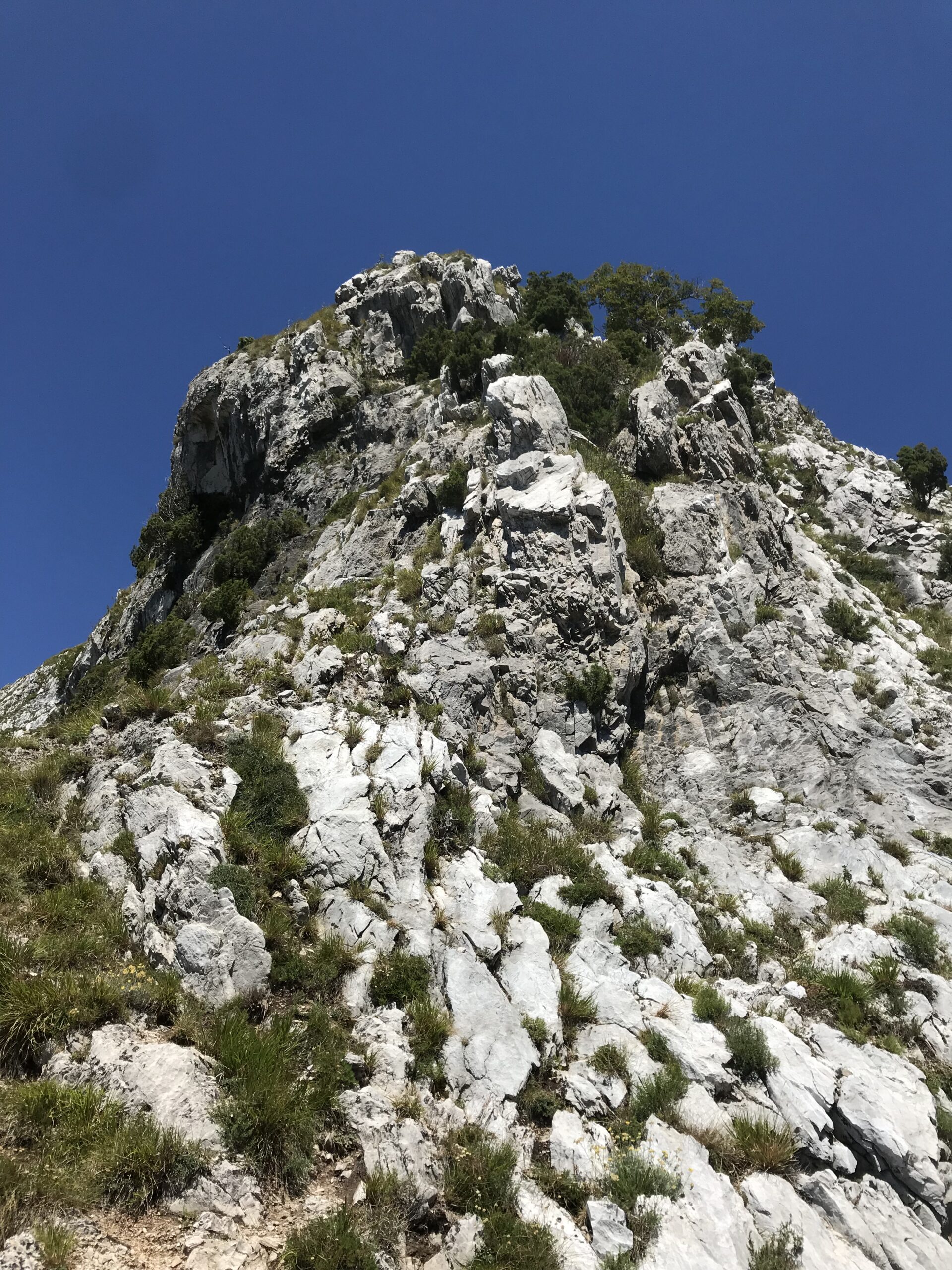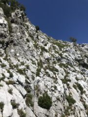 Breve itinerario chiodato dal basso. Dopo il primo tiro la roccia diventa a tratti da controllare e l’itinerario prettamente apuanico guadagna l’anticima del monte Antona. Da qui si può scendere per traccia a destra fino ad uno spit e da li alla chiesetta oppure arrivare in vetta e poco prima sulla sinistra reperire ad un albero cordone giallo con maillon. In alternativa arrivati in vetta si scende ad un canale sulla destra e si effettua una calata per la probabile via normale un po’ scoscesa e in 5 minuti porta all attacco delle vie