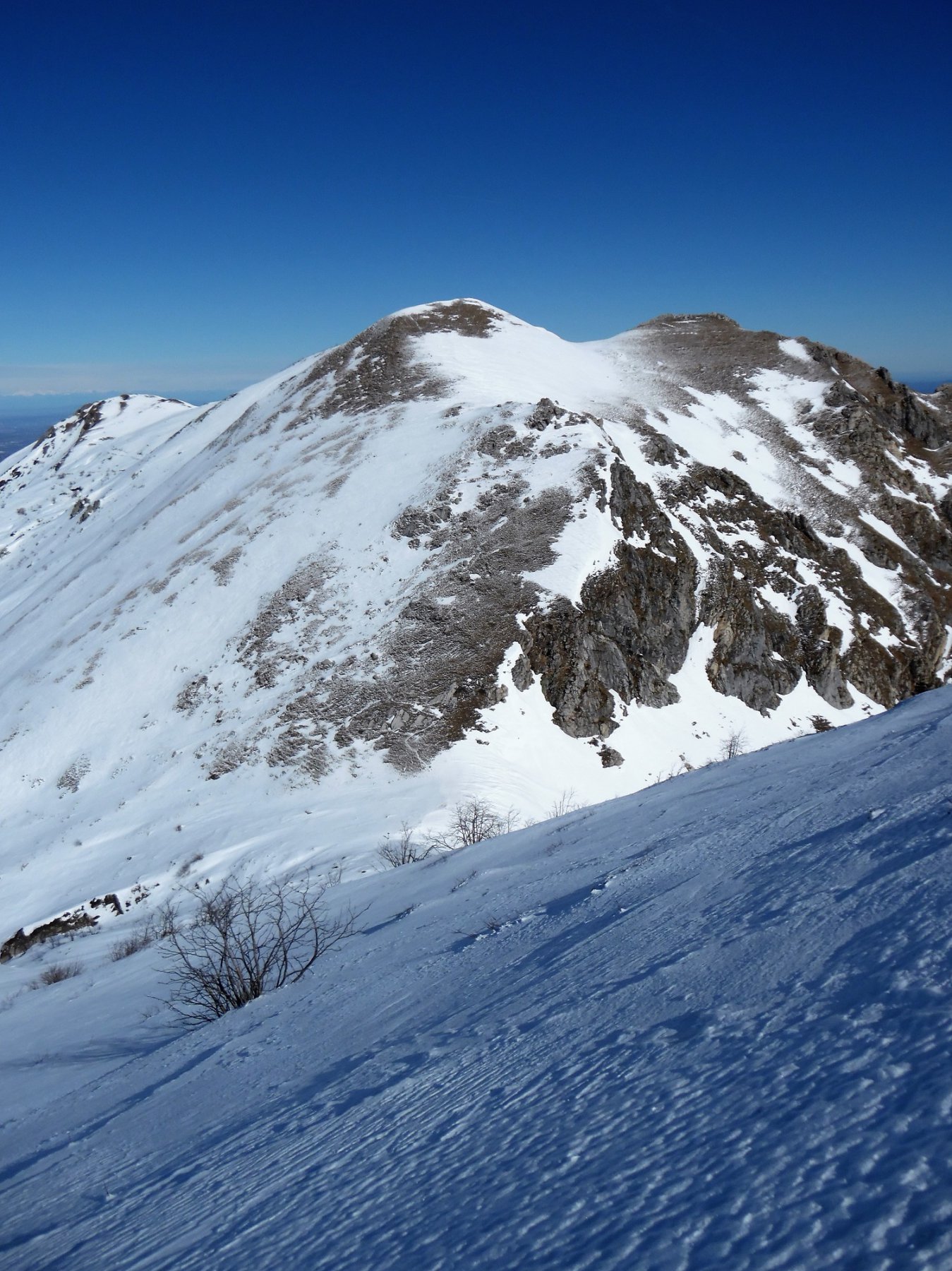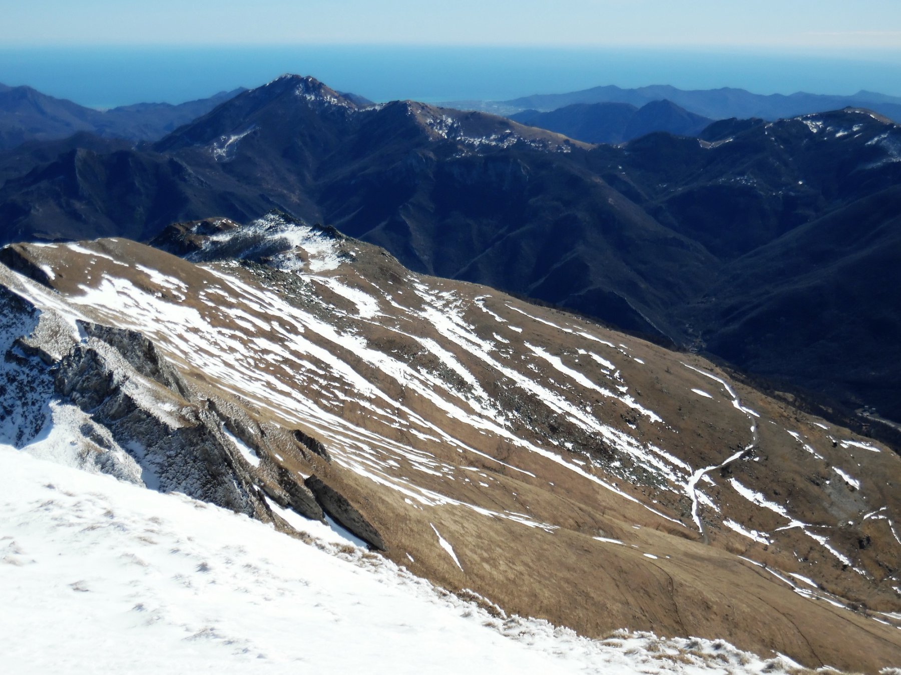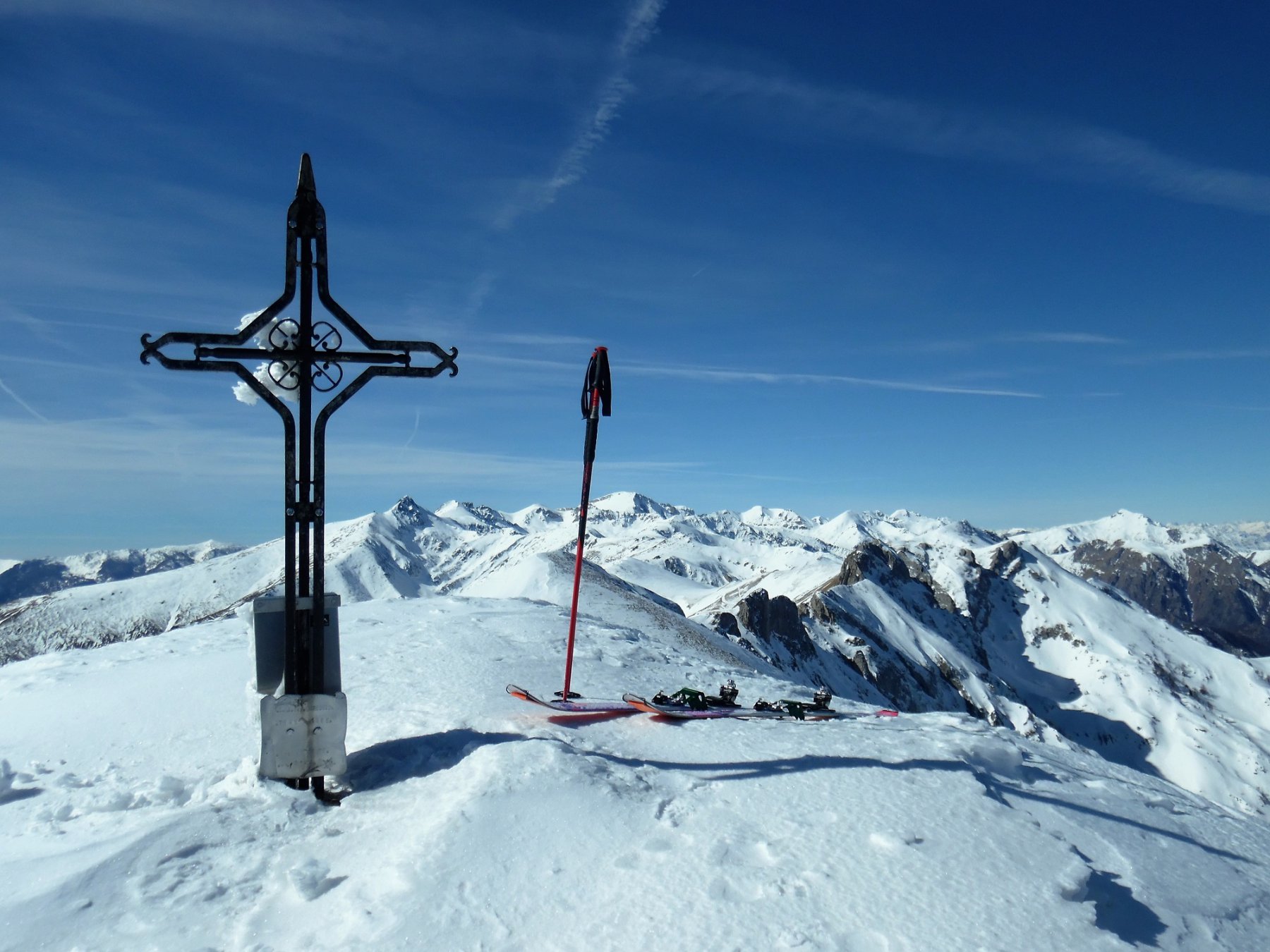 Dalla colla, a seconda della neve, affrontare l’ultima ostica salita, se siete fortunati bastano le pelli, se siete un po’ meno fortunati bastano i coltelli, se siete proprio sfigati (per modo di dire) andate di ramponi per cresta fino alla croce, (M.te Antoroto mt. 2144) una delle gite più belle di questa zona, oltretutto l’Antoroto non vede pressochè il sole, quindi resta in buone condizioni nonostrante la vicinanza con il mare (da qui generalmente ben visibile, e per i più fortunati con tanto di Corsica, Elba e Capraia).