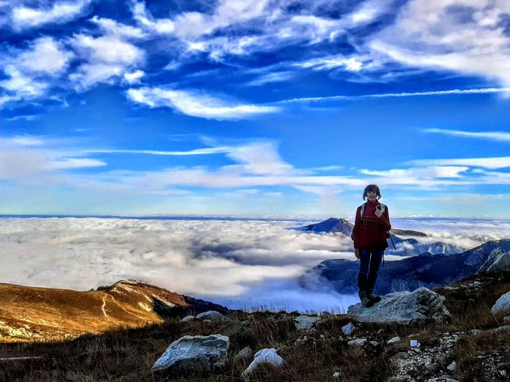 Sentieri asciutti, qualche frana post tempesta. Giornata calda e senza vento, gran mare di nubi sotto di noi, Corsica all’orizzonte tra grandi cumuli.