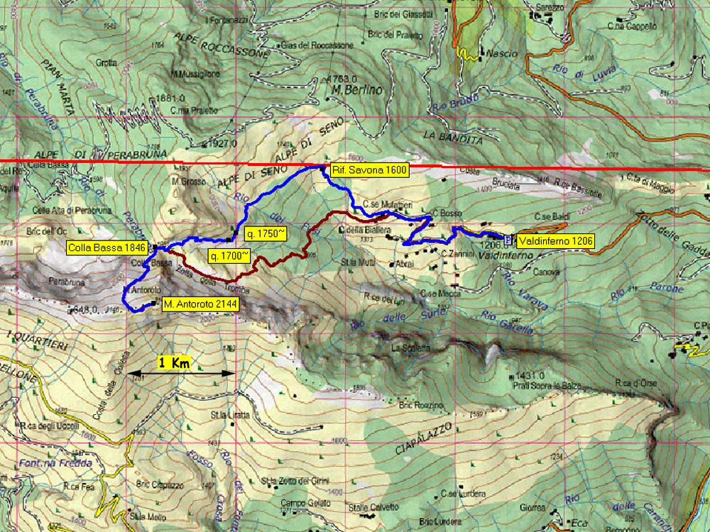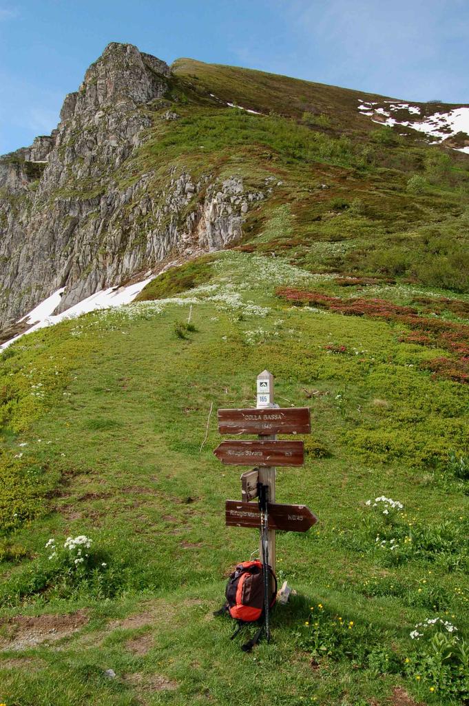 Da Case Mulattieri 1410, sono possibili due itin. per la Colla Bassa,uno Via Rif. Savona e l’altro Via la “Zotta della Tromba”. L’itin. per la Zotta della Tromba è un pò più diretto ed evita di perdere ~50 m di dislivello nel superare un colletto a q. 1750, prima della Colla Bassa. Da qui salire per cresta o per la normale del versante nord