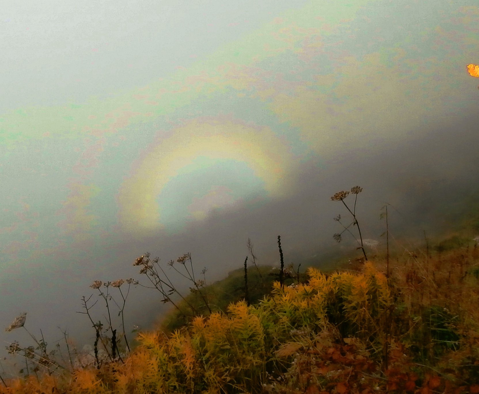 Passeggiata pomeridiana tra brume e colpi di sole, in due ore dalla chiesa alla cima. In discesa visti e fotografati piccoli arcobaleni circolari i famosi “Aloni della gloria”