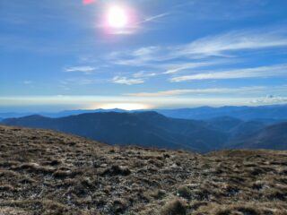 Neve quasi inesistente a salire, un velo di sporcatura bianca nella discesa. In entrambi i casi terreno ghiacciato e plachhe di ghiaccio vivo, seppur sempre evitabili. Ramponi rimasti nello zaino .