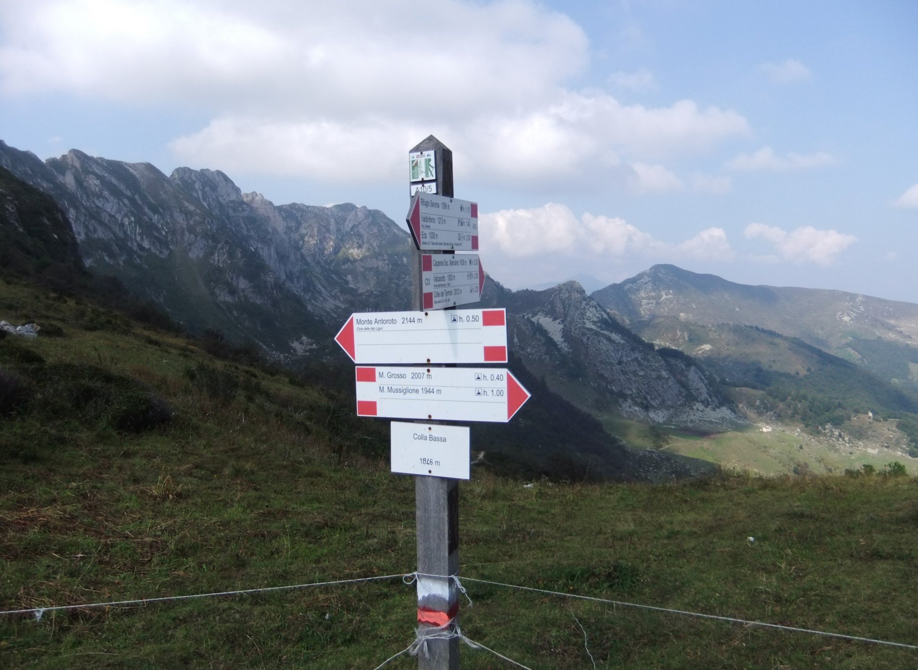 Il mio percorso è stato abbastanza differente da quello descritto nell’ itinerario per allungare un po’ il giro e toccare qualche altra vetta secondaria .Sono partito proprio dalla colla imboccando la prima sterrata e l’ho seguita ,tagliando un po’ per le piste , sino alla cima del Monte Berlino (ripetitore e vecchi impianti) . Ho proseguito deviando quasi subito a destra per le due modeste cimette del Monte Mussiglione e poi , tornando sui miei passi ,ho raggiunto il bel Monte Grosso .Sono quindi sceso alla Colla Bassa e poi risalito all’ Antoroto .Per il ritorno son risceso alla Colla Bassa ( attenzione al sentiero che può essere scivoloso !) e poi , tramite l’impervio Passo delle Caprette , ho raggiunto il Rifugio Savona e quindi la Colla di Casotto .Sentieri molto ben indicati , con svariati cartelli e segnavia bianco rossi .Giornata con tempo variabile dal soleggiato al nuvoloso ma senza minacce di pioggia .Venticello frizzante sui crinali ma parecchia foschia che limitava la visuale a pochi chilometri .Visti un daino ed un paio di camosci .Qualche stentata stella alpina al Colletto dell’Antoroto.Incontrati alcuni escursionisti in vetta all’Antoroto e diversi altri al Rifugio Savona.Circa 16 chilometri per almeno 1000 metri di dislivello .