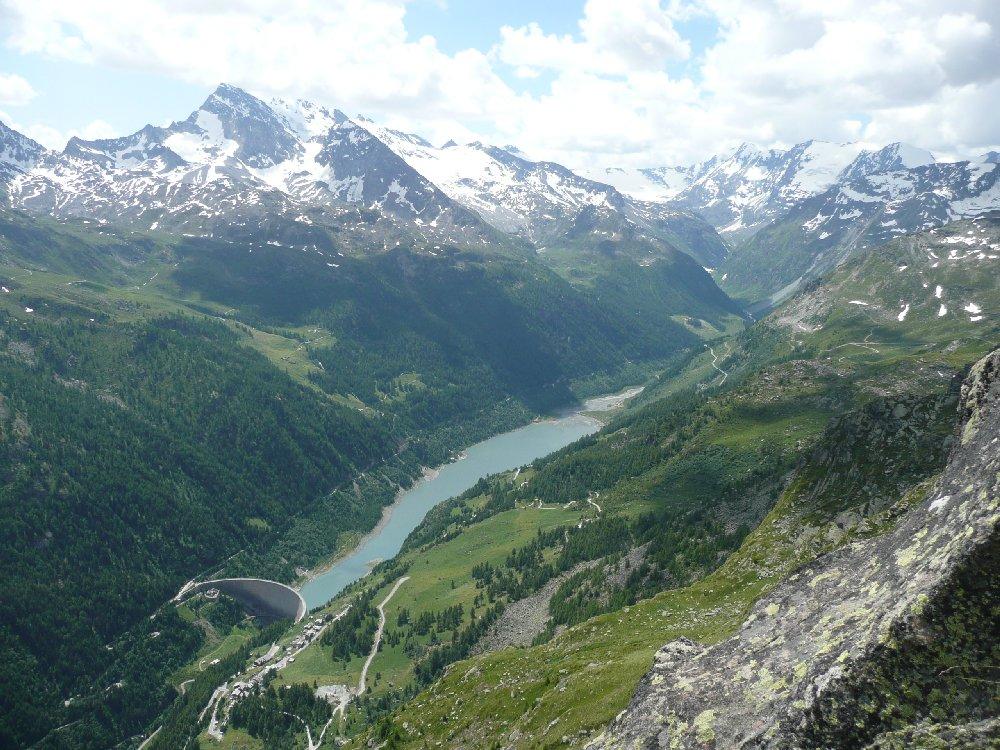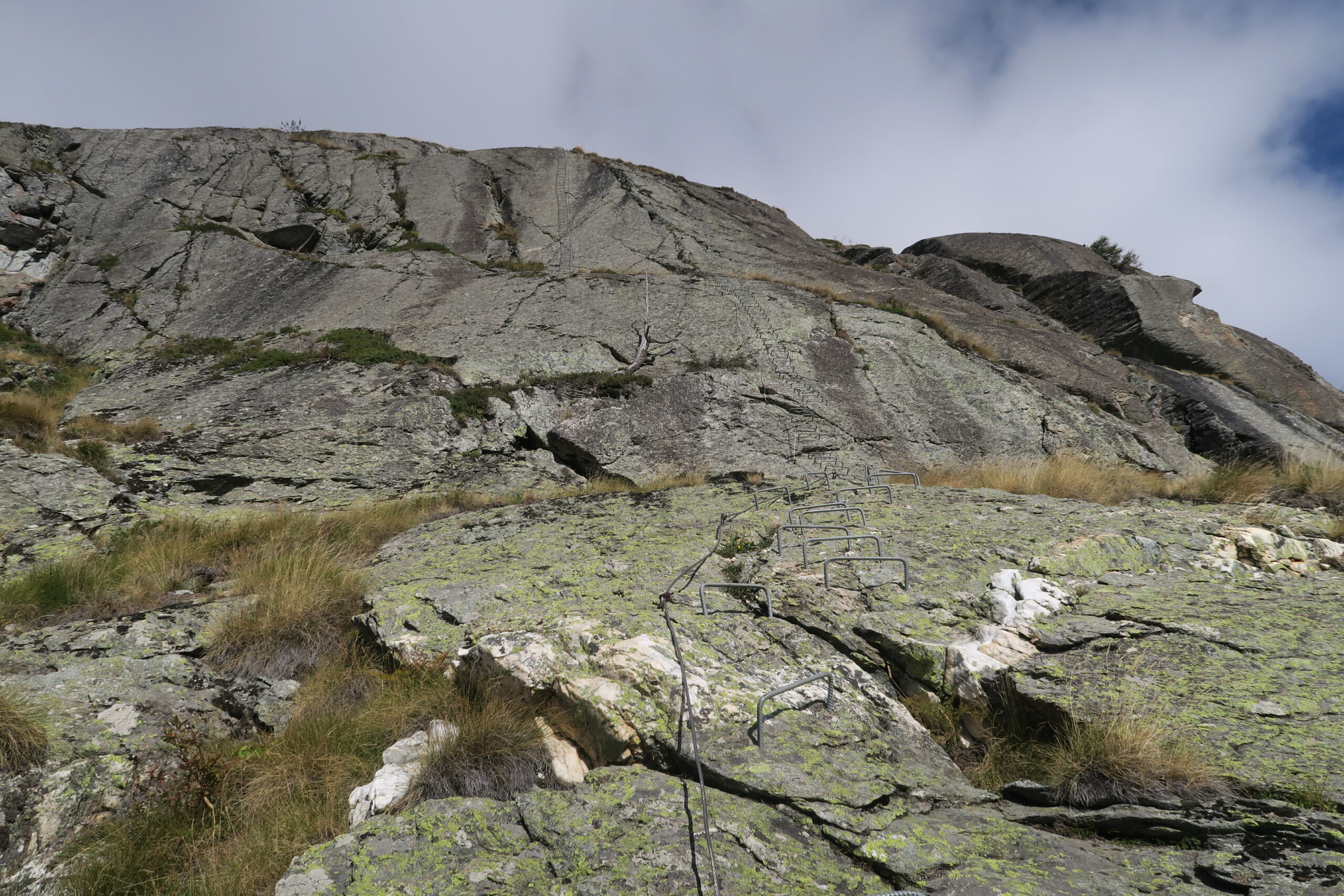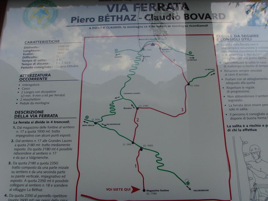 Si sale subito sulla verticale di una placconata scura, in parte bagnata dalla fuoriuscita di rivoli d’acqua. Si seguono i gradini che, dopo un traverso a destra, piegano decisamente a sinistra e si dirigono in verticale sotto un primo tetto, molto pronunciato. Appena raggiunto, i gradini lo superano sul bordo sinistro e proseguono al di sopra, iprendendo un percorso verticale. Si superano altri tetti in successione e,poco a poco, si prende quota avendo un’ampia visione della valle, del bacino della diga sottostante e della catena di monti che dividono la Valgrisenche dalla Val di Rhêmes verso est:dalla Grande Rousse al Truc Blanc, fino alla Grande Traversière. Il primo tratto di ferrata termina sul sentiero n.17 a quota di 1930mt.Lo si segue in salita per pochi tratti e, dopo poche svolte (a quota di 1950 m), si riprende la ferrata percorrendo una nuova serie di pareti verticali. Si continua a salire sulla lunga scalinata di gradini d’acciaio, fino ad arrivare ad un piccolo ripiano (la zona delle Grandes Laures) ricco di bassa vegetazione e di rododendri. Poco oltre, a quota di 2180 m, terminate le due prime sezioni della parete, si raggiungono alcuni cartelli indicatori gialli nei pressi di un bivio di sentieri, accanto ad alcuni roccioni. Si trascurano le indicazioni verso sinistra e si piega a destra su un sentiero che si inoltra in mezzo a rari pini mughi e a cespugli d’alta quota. Il sentiero perde quota e contorna una larga parete verticale attraversando pendii scoscesi.