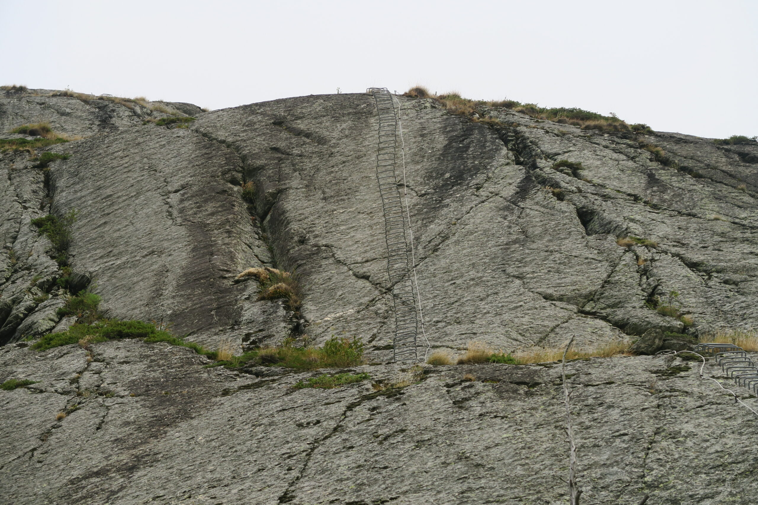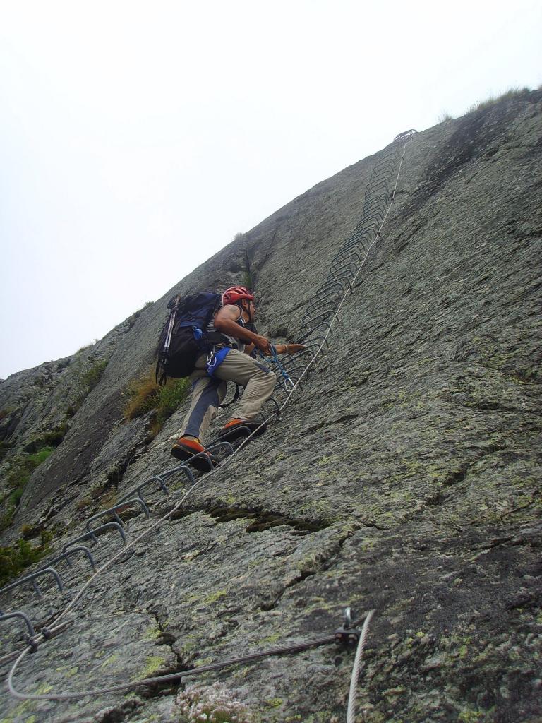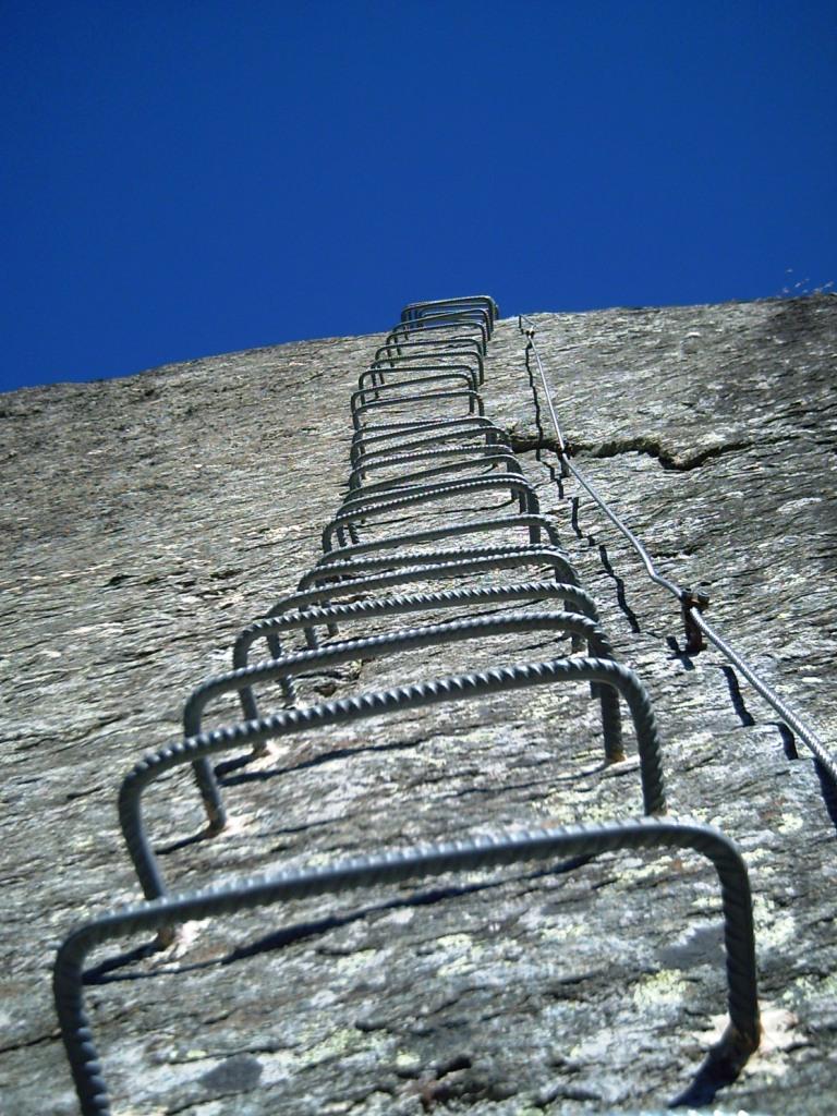 Si contornano e si superano alcuni roccioni e lo spigolo molto evidente della parete, fino a raggiungere un piano inclinato. Seguendo i gradini e le corde e superando qualche tornantino, ci si avvicina ad una nuova zona di parete liscia e verticale.