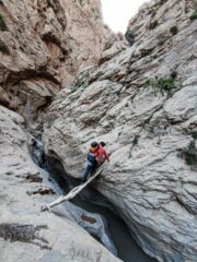 Accesso dal Canyon Apache (attenzione alle piene). Via continua tra il 6a e il 6b. Tutta da scalare, mai banale.