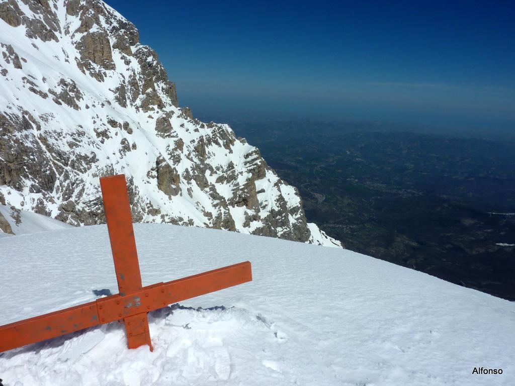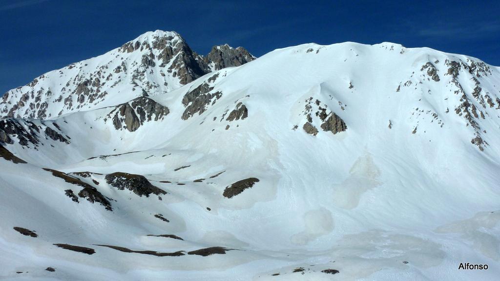 Giunti alla Sella di Monte Aquila (2335 m) si prosegue in direzione NNE prendendo la cresta che conduce alla vetta, lasciando il costone che si dirige verso la mole rocciosa del Como Grande. Si segue la cresta, con splendido panorama sul Como Grande e sulla Valle dell’Inferno, fino in vetta (attenzione alla cresta che può presentare difficoltà e pericolose cornici). Dalla vetta si può iniziare a scendere evitando, prudentemente, alcune fasce rocciose e scegliendo il percorso più pulito.