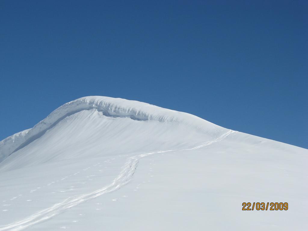 Lasciata l’auto seguire il torrente e infilarsi nel canalone che costeggia la palestra di arrampicata. Quando il canale si apre portarsi sulla spalla di sx e risalire i ripidi pendii (30 – 40 gradi ) fino a sbucare sul cugno dell’ Alpet, da li per cresta passare dalla Madonna della Pace e scendere al c.tto dell’Aquila per poi risalire alla punta